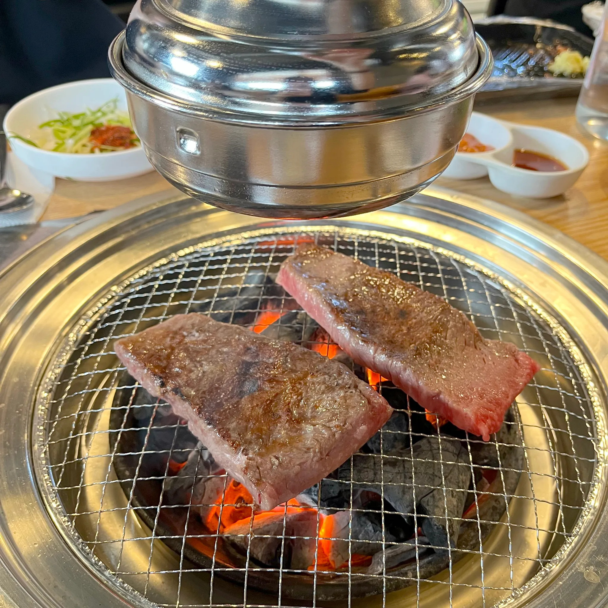 바로 건너편 3층에 있는 신숯불탁탁이라는 곳으로 향한 우리. 상차림비만 내면 되고, 육회무침비나 된장찌개, 공기밥, 냉면은 별도였다. 맛있게 구워지고 있는 우리의 설원등심