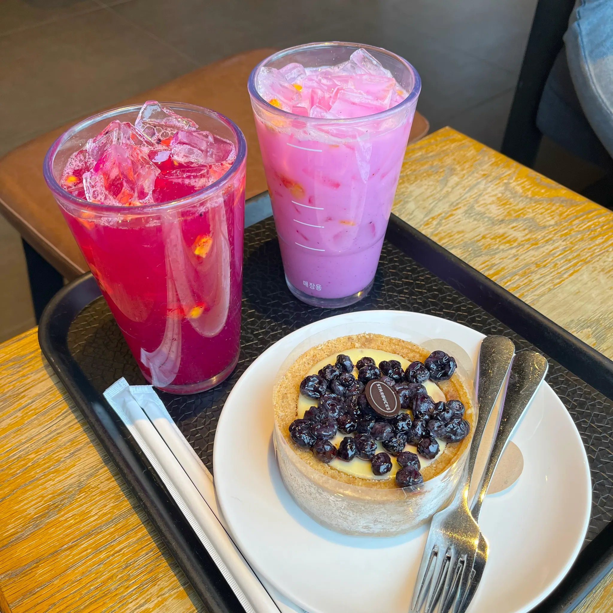 오랜만에 만나는 친구 만난 날. 궁금했던 스타벅스 신메뉴를 먹어보았다. 친구는 망고 용과 레모네이드 스타벅스 리프레셔, 나는 퍼플 드링크 위드 망고 용과 스타벅스 리프레셔. 너무너무 예쁜 색🩷🩷 무슨 마법 포션같다ㅎㅎㅎ 맛은,, 한 번 먹었으니까 됐다!싶었던 맛ㅎ