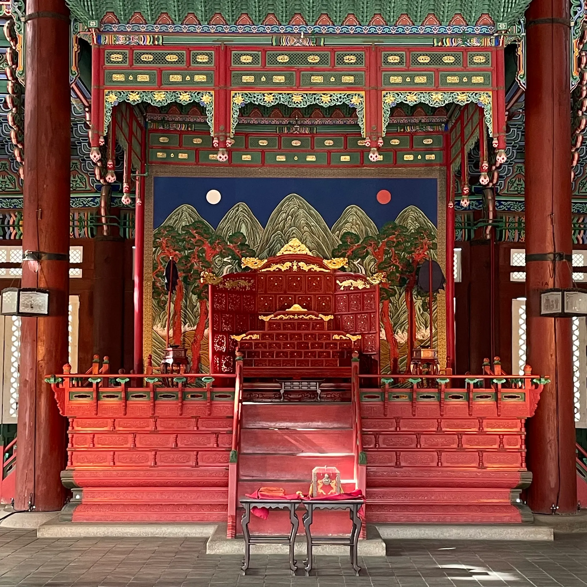 내가 너무너무너어어어무 좋아하는 일월오봉도. 정말 너무 멋있다. 깨알 미술사 지식을 써보자면, 원래 일월오봉도는 저 앞에 왕이 있어야 비로소 완성되는 그림이다. 그래서 저 그림은 왕이 어디를 가든 늘 뒤에 따라다녔는데, 심지어 왕의 관 뒤에도 자리할 정도. 즉 지금의 저 그림은 앞에 왕이 없으니 미완성 상태인 셈.