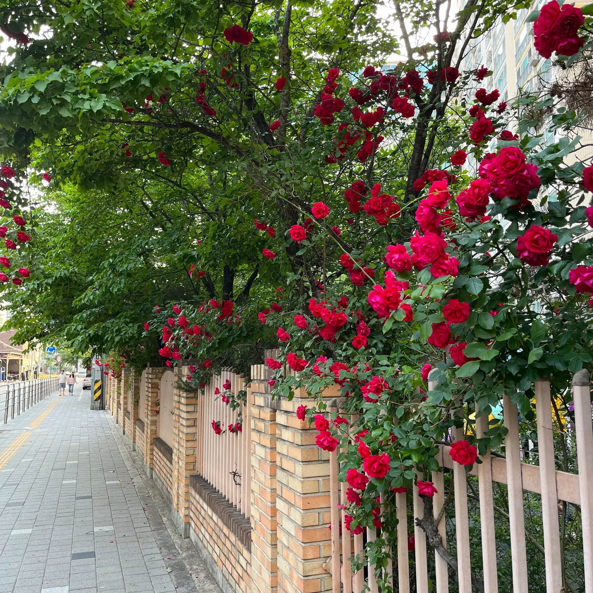 셋 다 배가 터질 지경이라 산책할 겸 할리스까지 걸어가기로. 장미꽃 담장이 너무 예뻤다