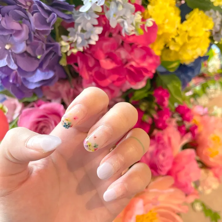 이 때 웨딩네일하고 손톱 다듬은 거 아깝다고 생화네일을 했었는데 라운지에 있던 꽃이랑 잘 어울려서 같이 찍었다.