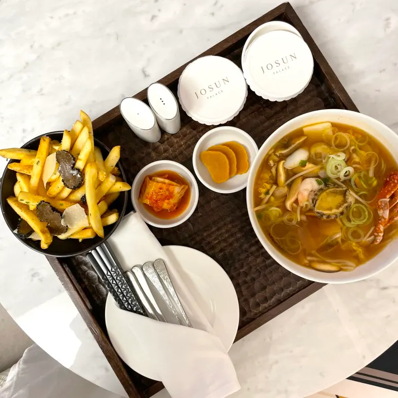 룸서비스로 시킨 트러플 감자튀김이랑 해물라면.