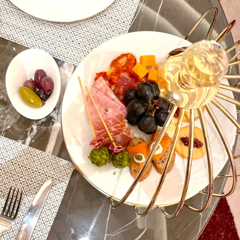 생햄이랑 치즈, 올리브, 과일이 있는 모듬안주랑