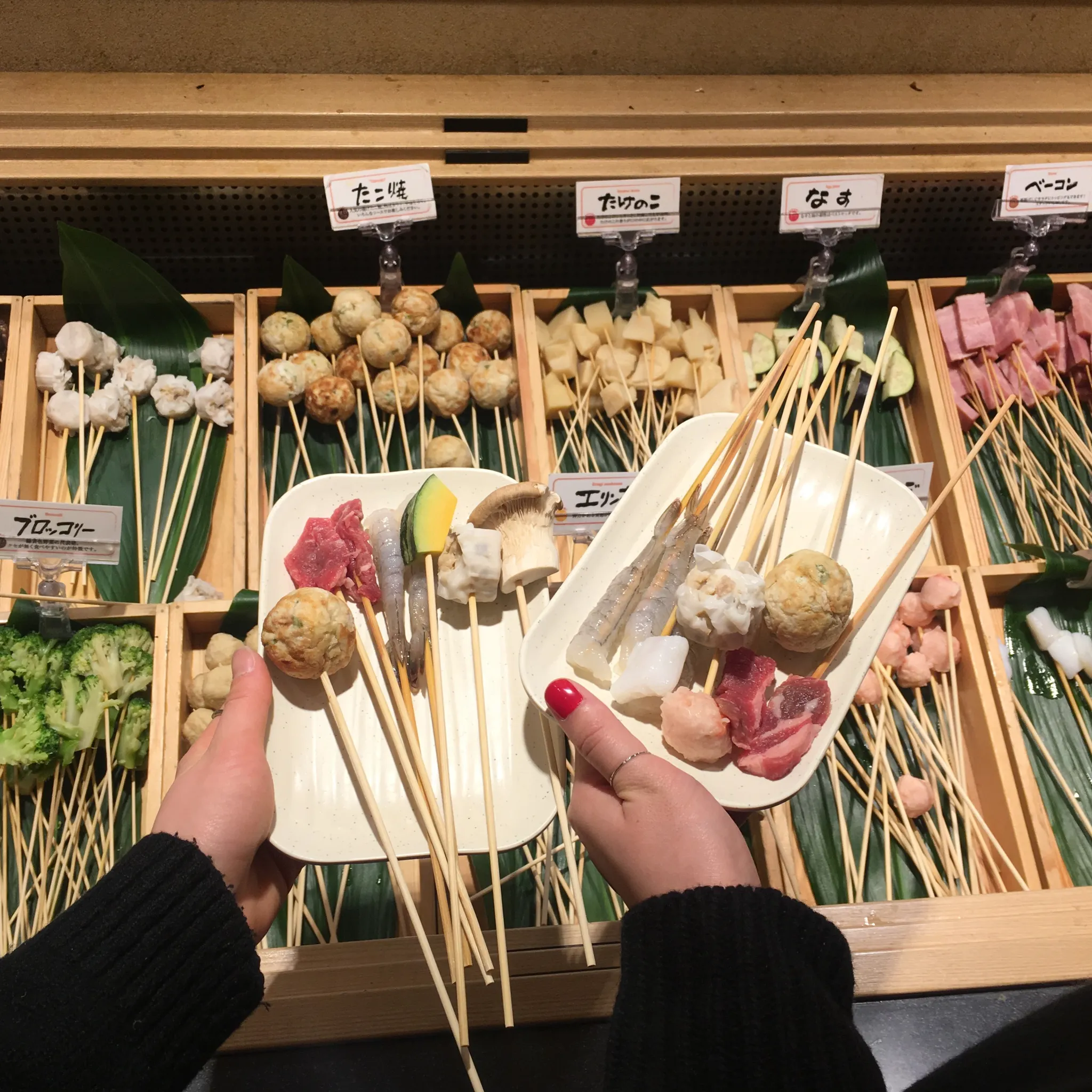 신주쿠를 떠나기 전 마지막 점심은 역시 동생이 알려준 도쿄 맛집, 쿠시야모노가타리. 무한리필 셀프 꼬치튀김 집이다. 고기, 생선, 야채 등등등 다양한 튀김들을 뷔페처럼 가져다가 알아서 튀겨먹는 것. 자리에 있는 반죽과 빵가루를 묻히고 튀겨먹는 방식이다. 처음 한 접시는 재미있었는데 그 다음부터는 약간 귀찮아짐쓰..ㅎ 고르면 튀겨서 갖다주면 좋겠다고 생각했다.