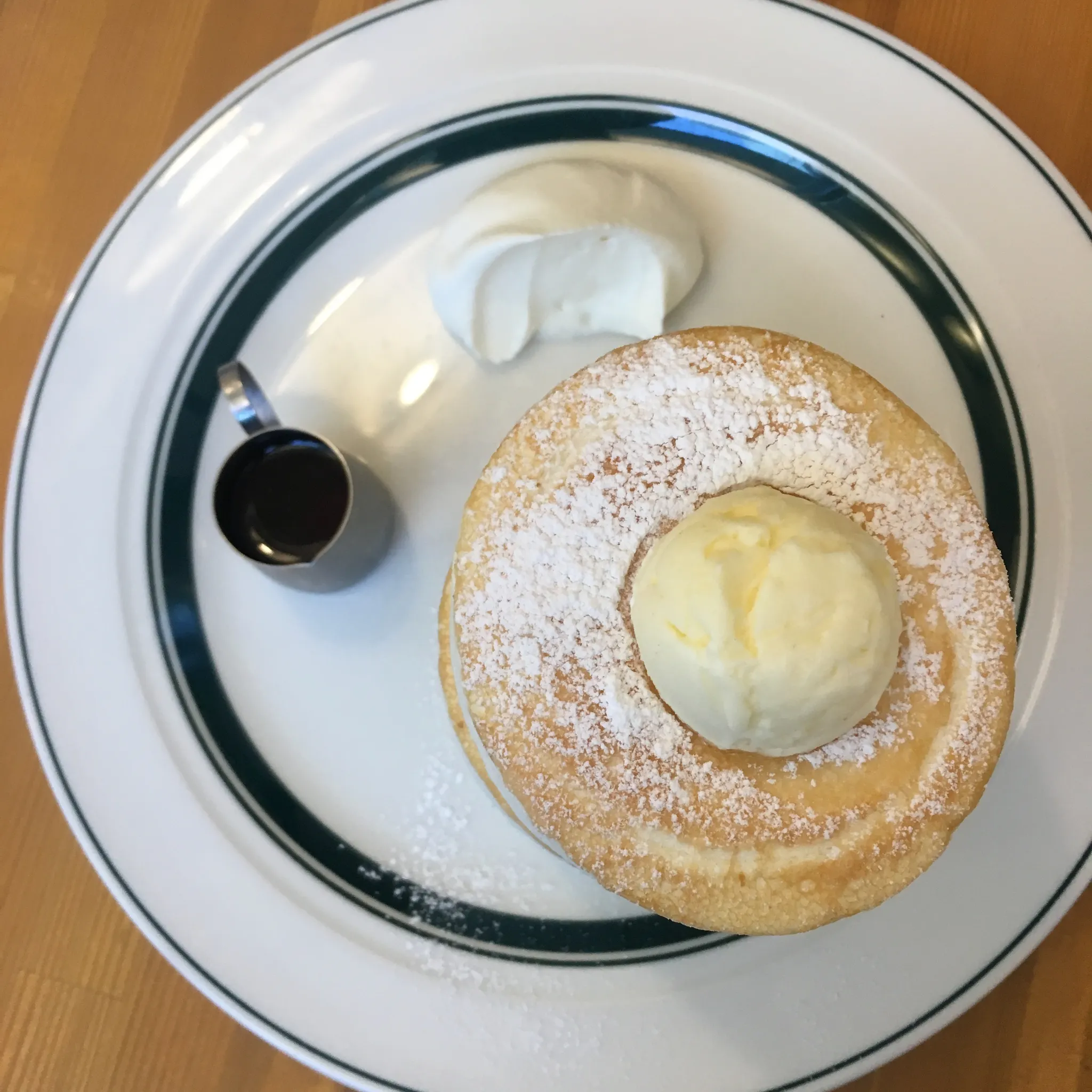 짠! 우린 운 좋게 시킬 수 있었다! 두툼하고 폭신해보이는 3단 팬케이크. 맨 위에는 버터와 슈가파우더가 올라가 있고, 옆에는 생크림과 메이플 시럽이 있다.