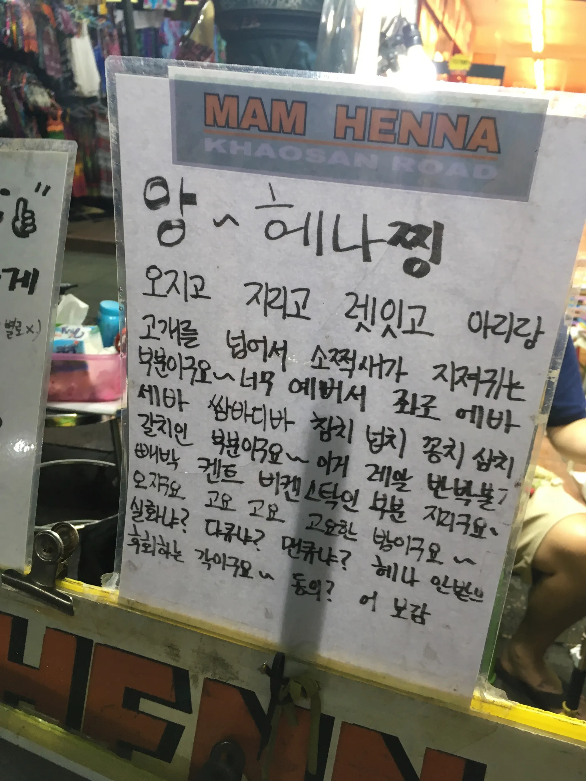 ㅋㅋㅋㅋㅋㅋㅋㅋㅋㅋㅋㅋㅋㅋㅋㅋㅋㅋㅋㅋㅋㅋㅋㅋㅋㅋ아니 이거 뭐냐고. 진짜 어이가 없어섴ㅋㅋㅋㅋㅋㅋ 보자마자 현웃터짐ㅋㅋㅋㅋㅋㅋㅋ 우리는 여기에서 인생 처음으로 헤나를 한 개씩 받았다. 세 명이서 440바트.