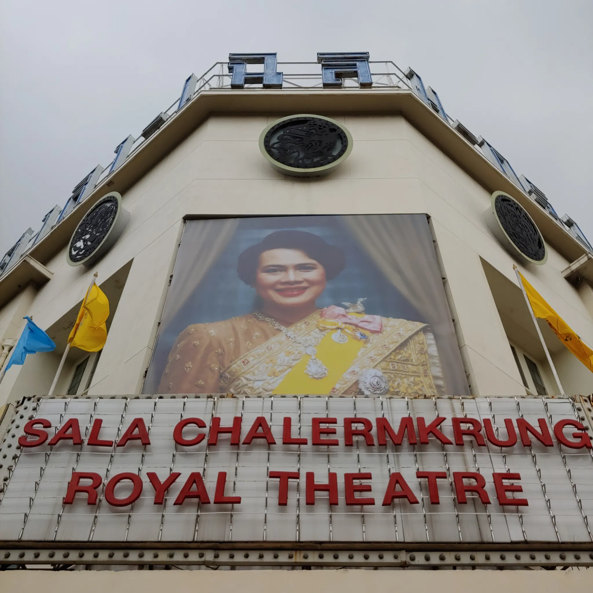 왕실 극장인 쌀라 찰름끄릉 극장 Sala Chalermkrung Royal Theatre. 태국 최초의 서양식 영화관이라고 한다. 안에서는 태국 전통 노래와 춤 공연 중. 사진은 시리킷 왕대비로, 현 국왕의 어머니이다.
