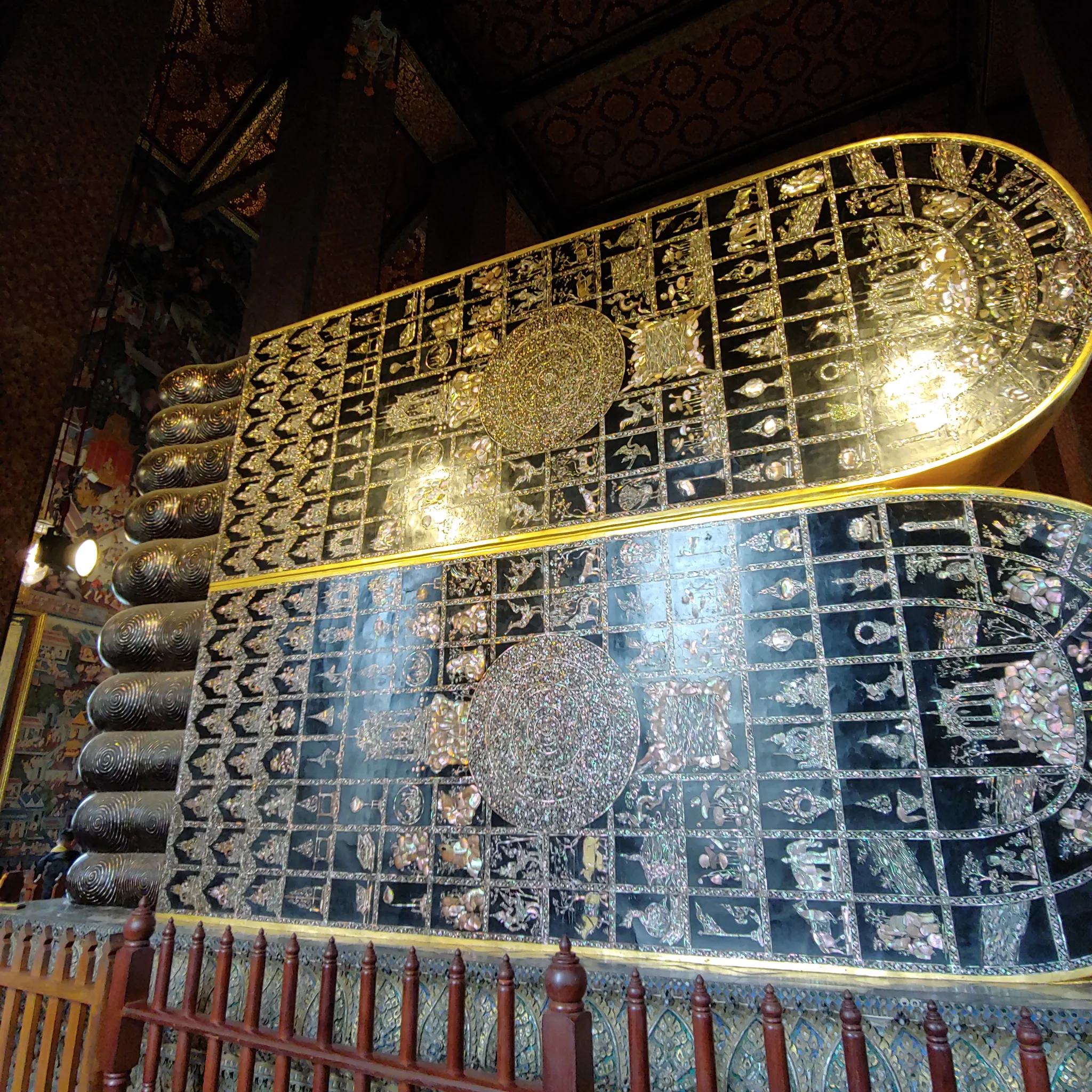 부처님 발바닥이다. 발만 해도 양발 기준 높이 3미터, 너비 4.5미터라고 한다. 중앙에는 차크라 문양이 있고, 주변으로는 자개로 꽃, 코끼리 등 삼라만상을 표현해 놓았다. 자세히 보면 볼 수록 디테일에 감탄.