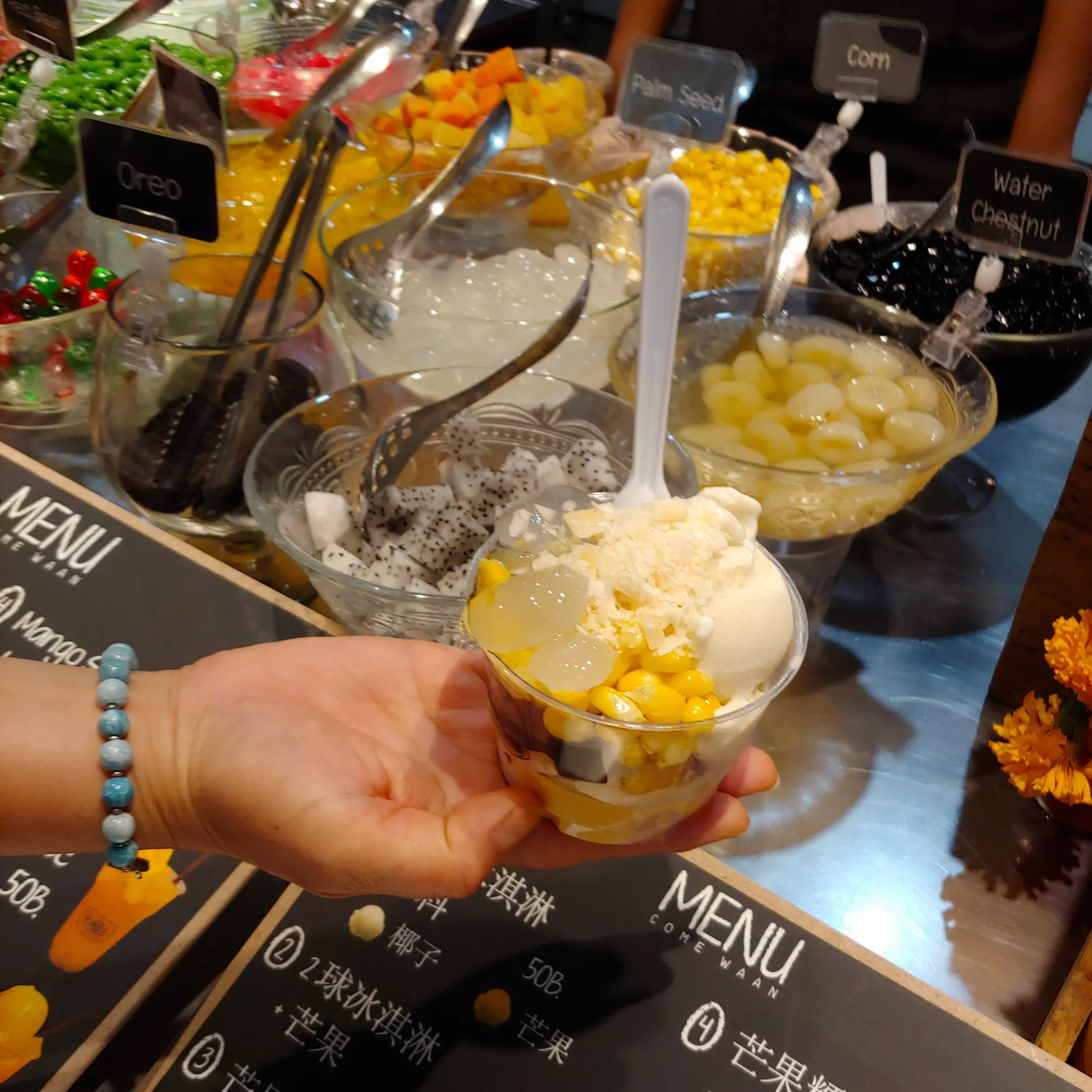 동생이 코코넛 아이스크림 먹고 싶다고해서 하나 겟. 특이하게 토핑을 원하는대로 추가할 수 있다. 양껏 추가했는데도 단돈 50바트.