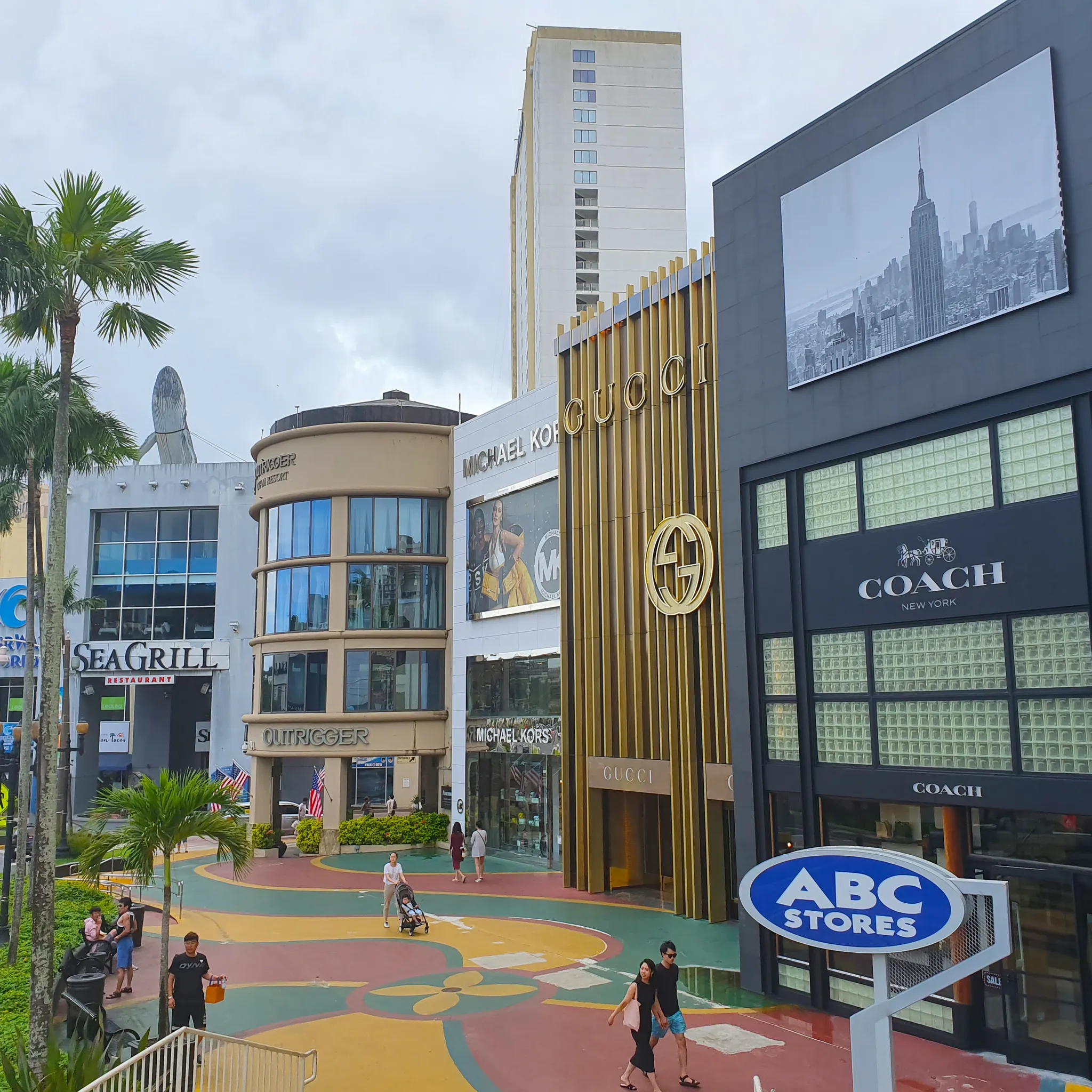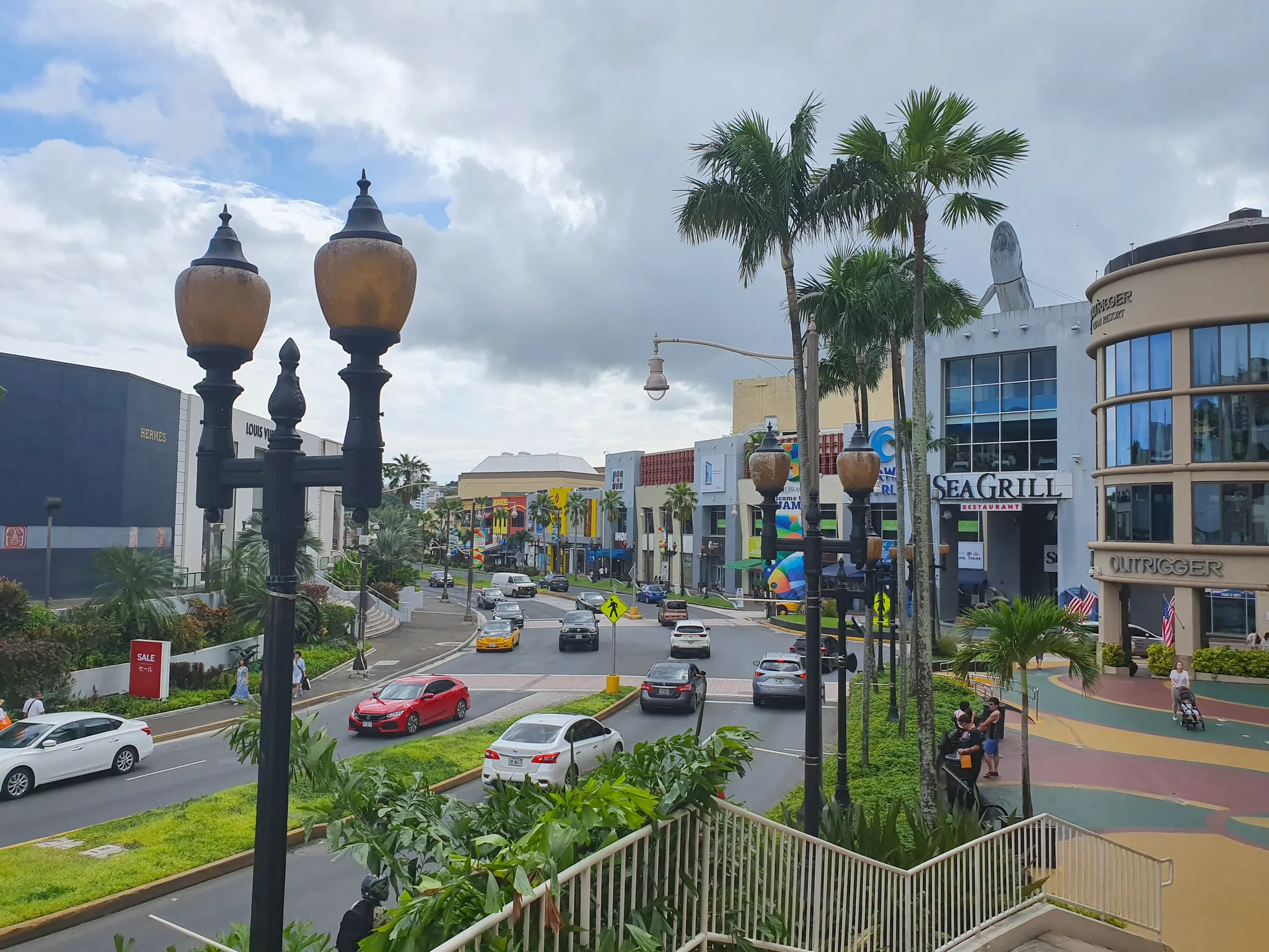 쇼핑몰들이 모여있는 투몬 Tumon 지역. 사진에서 보이는 이 쪽은 더 플라자 The Plaza이다. 건물 바깥 쪽에서 보았을 때에는 각각 단독 매장인 듯 보이지만, 안쪽으로는 두짓타니 호텔, 아웃리거 호텔과 연결이 되어 있다.