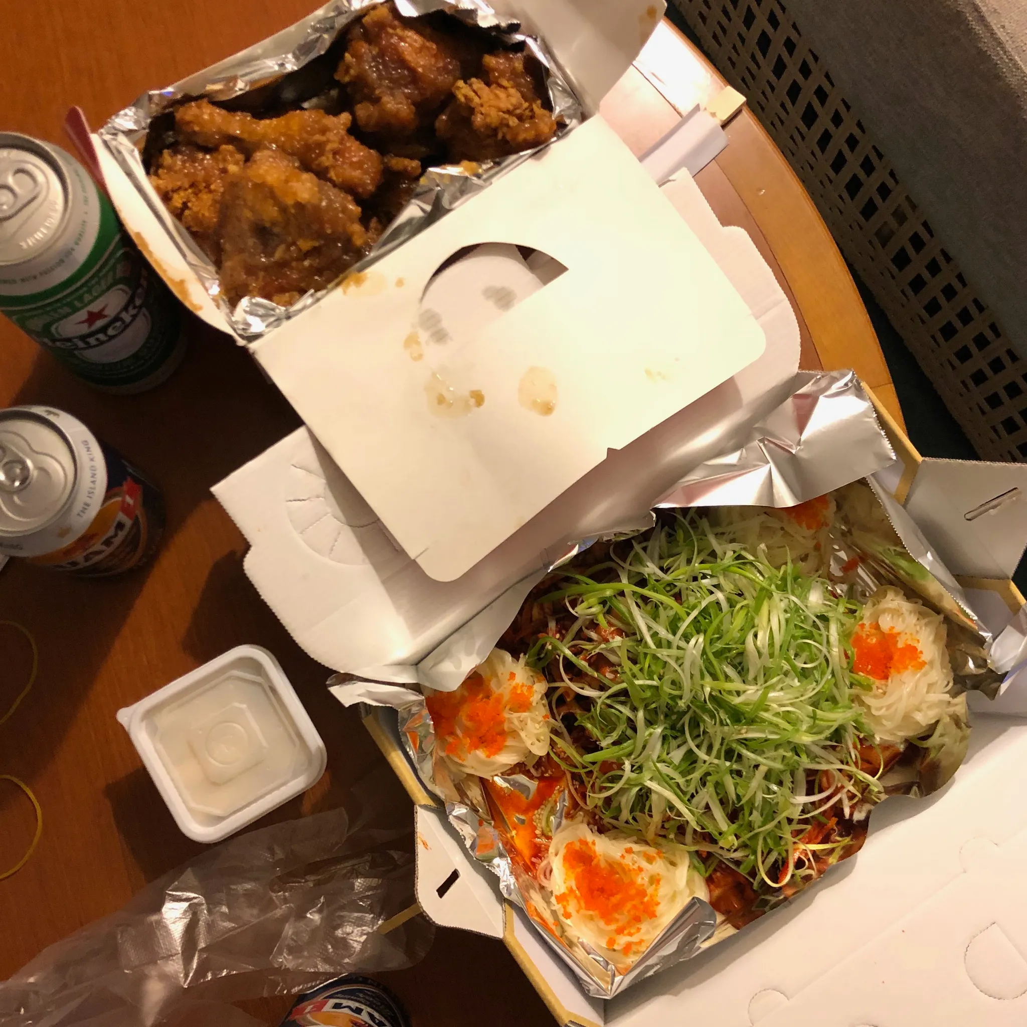 한국의 맛을 먹어야겠다며 썬더치킨에서 마늘 치킨이랑 골뱅이 소면 주문. 타국에서 기분 상했을 때 먹는 고향의 맛.
