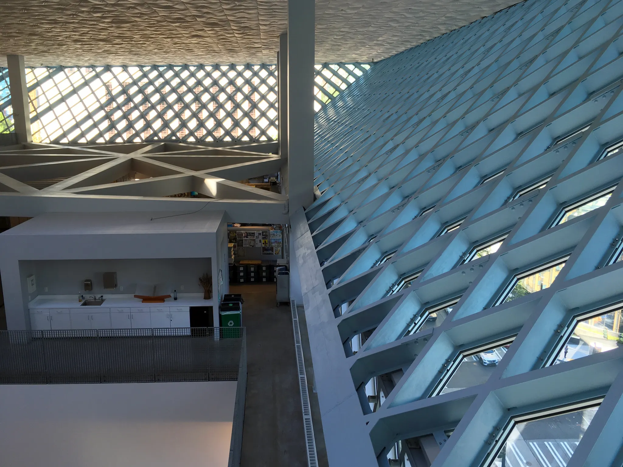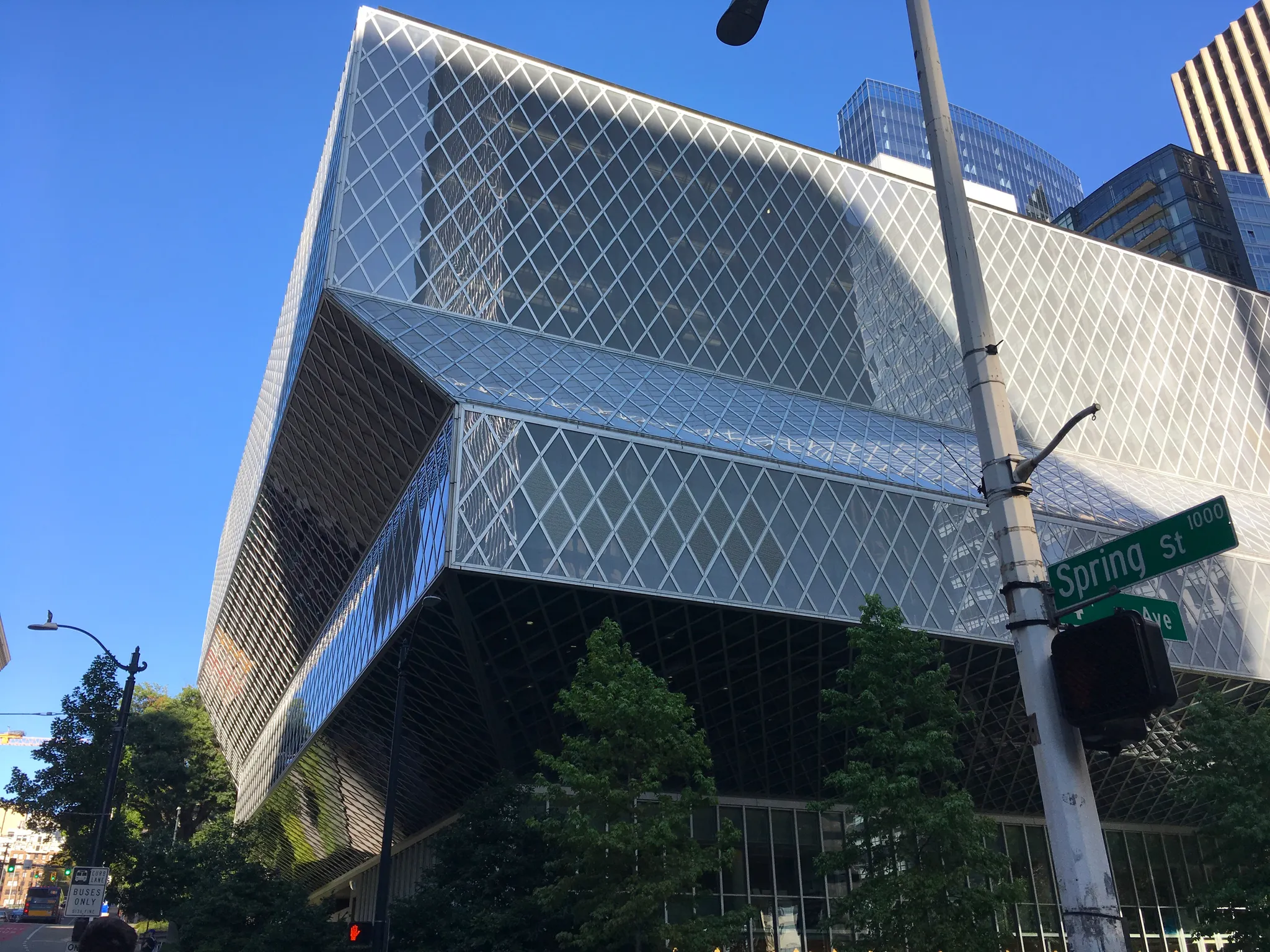 멀리에서부터 시선을 확 끄는 유리로 만들어진 다각면체 건물로, 하버드대 건축학부 교수이자 세계적인 건축가인 렘 콜하스 Rem Koolhaas가 설계했다고 한다. 참고로 렘 콜하스는 건축계에서 탑티어 상인 프리츠커상 수상자로, 시애틀 중앙 도서관은 콜하스를 언급할 때 빠지지 않는 대표작이다.