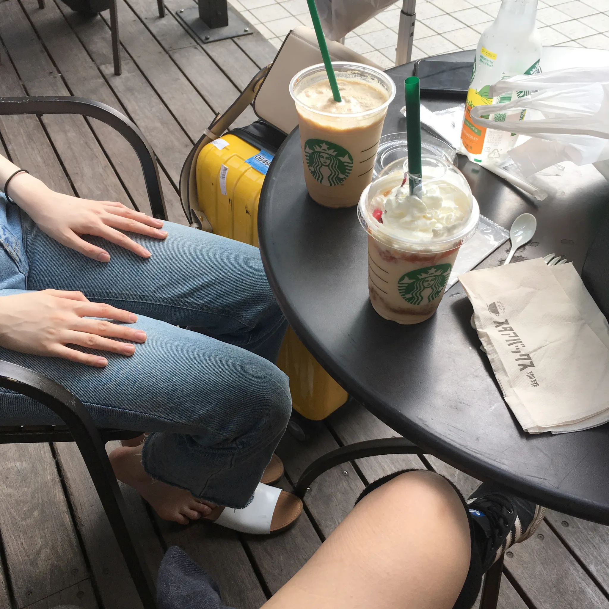 캐리어도 있고 마침 날씨도 좋고, 야외 테라스에 자리 잡은 우리.