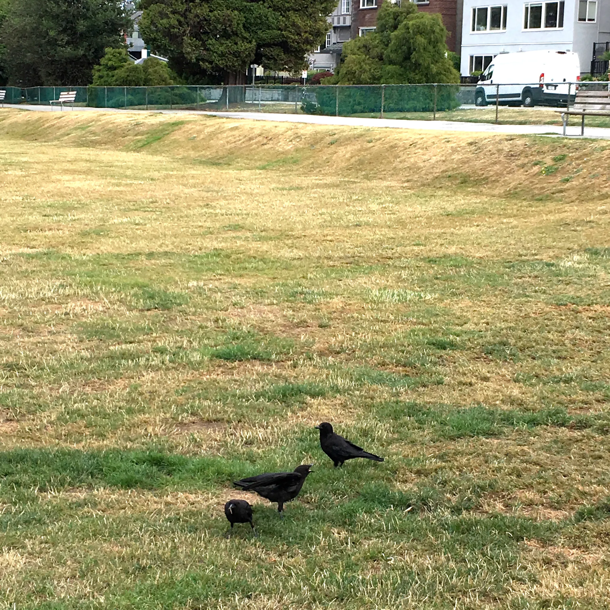 키칠라노 해변 옆 잔디에서 총총 뛰어다니는 까마귀 세 마리.