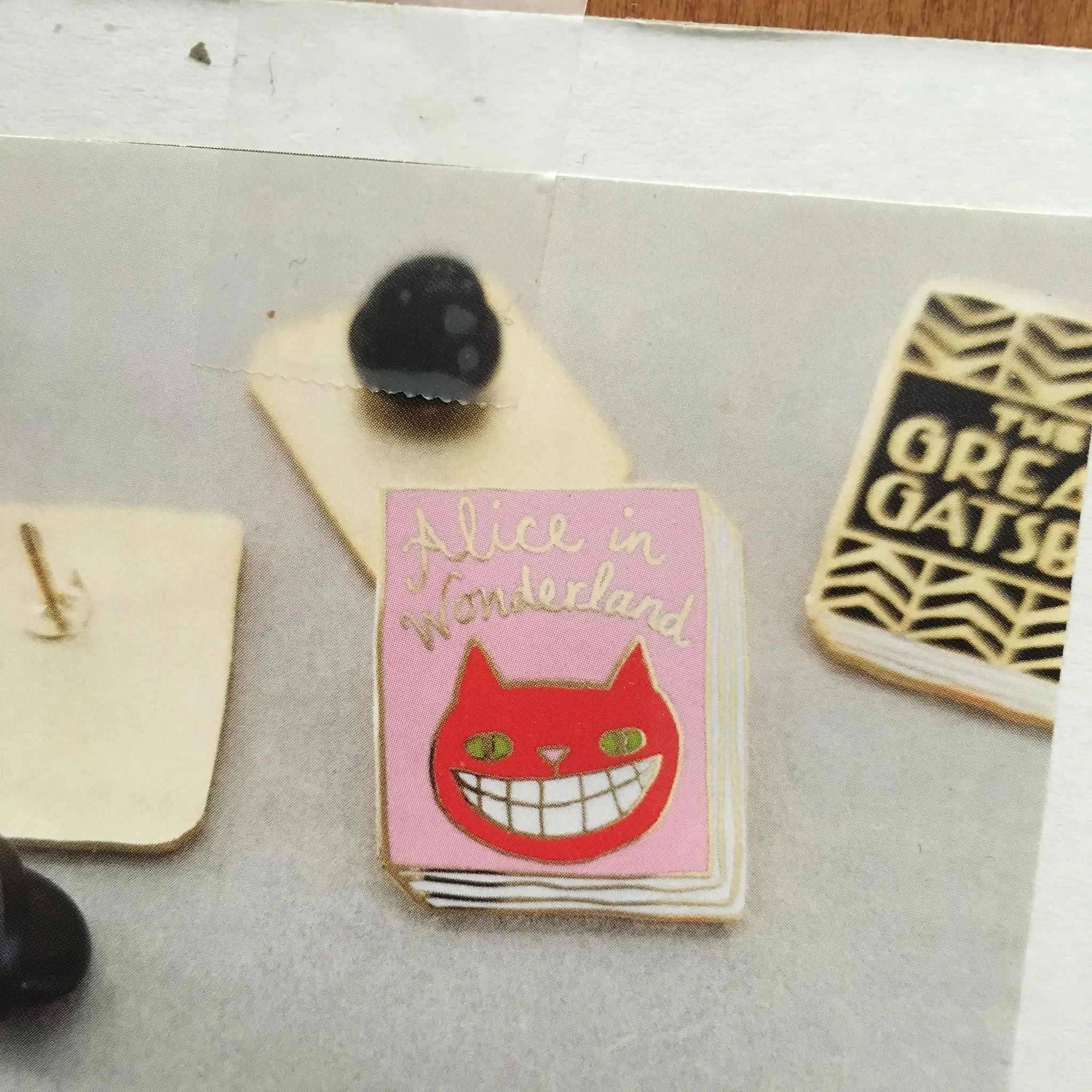 요건 책을 핀 뱃지로 만든 기념품인데, 사진 속에 보이는건 이상한 나라의 엘리스 체셔캣, (오른쪽으로 위대한 개츠비도 보인다)