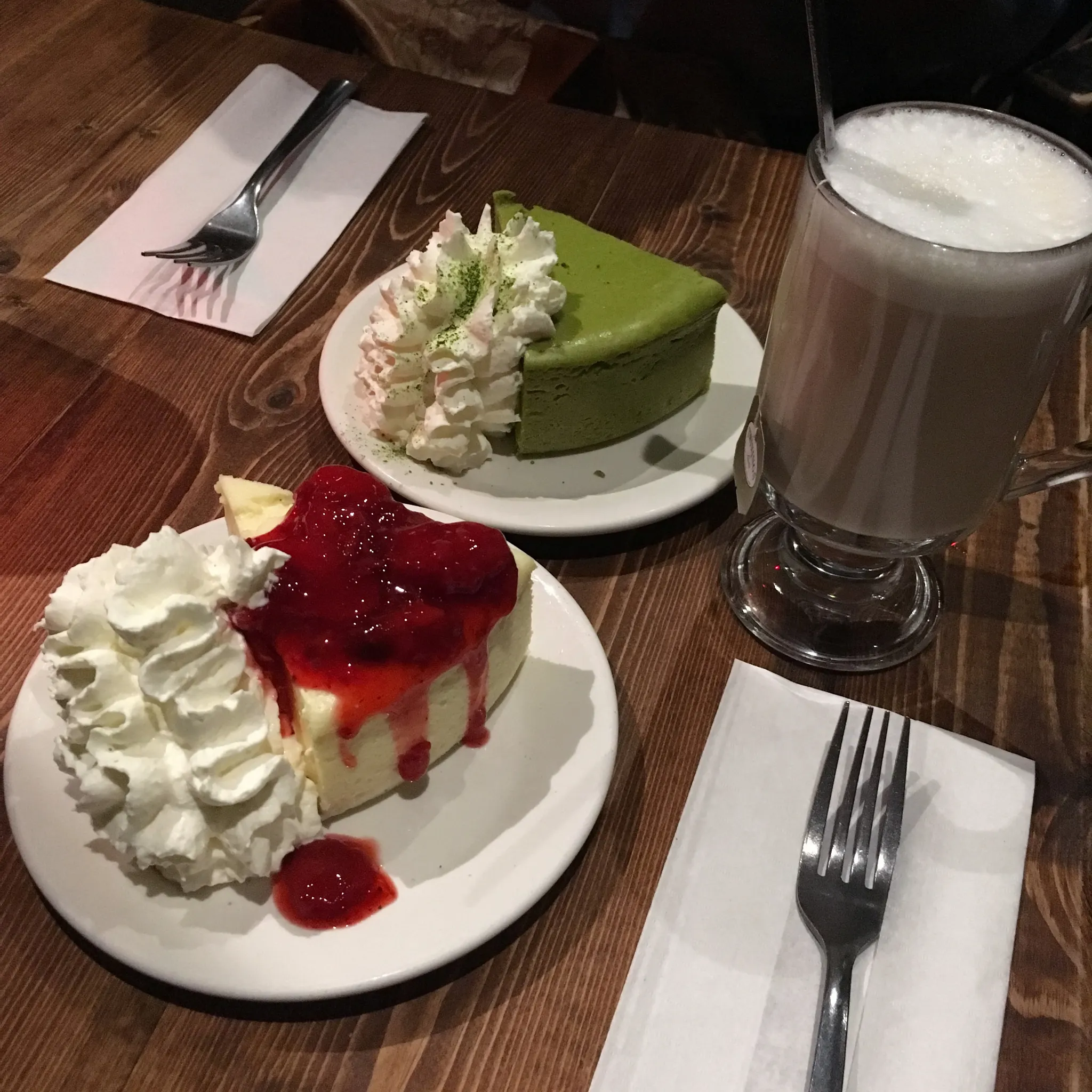 나는 오리지널 치즈 케이크에 딸기토핑, 엄마는 말차 치즈케이크를 시켰다.