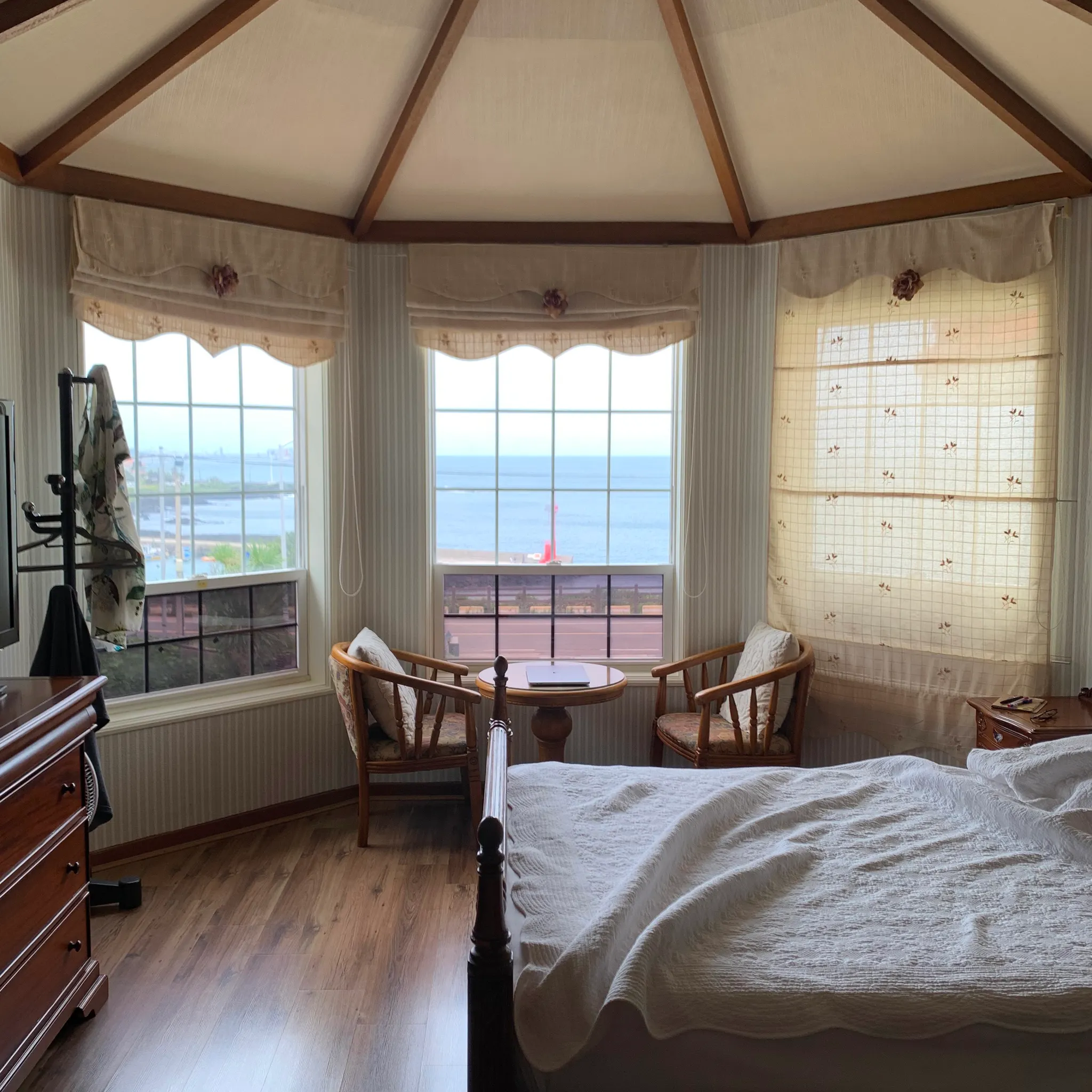 아침에 보는 숙소 뷰. 탁 트여있는 창으로 바다가 훤히 내려다보여 아침부터 기분이 좋다.