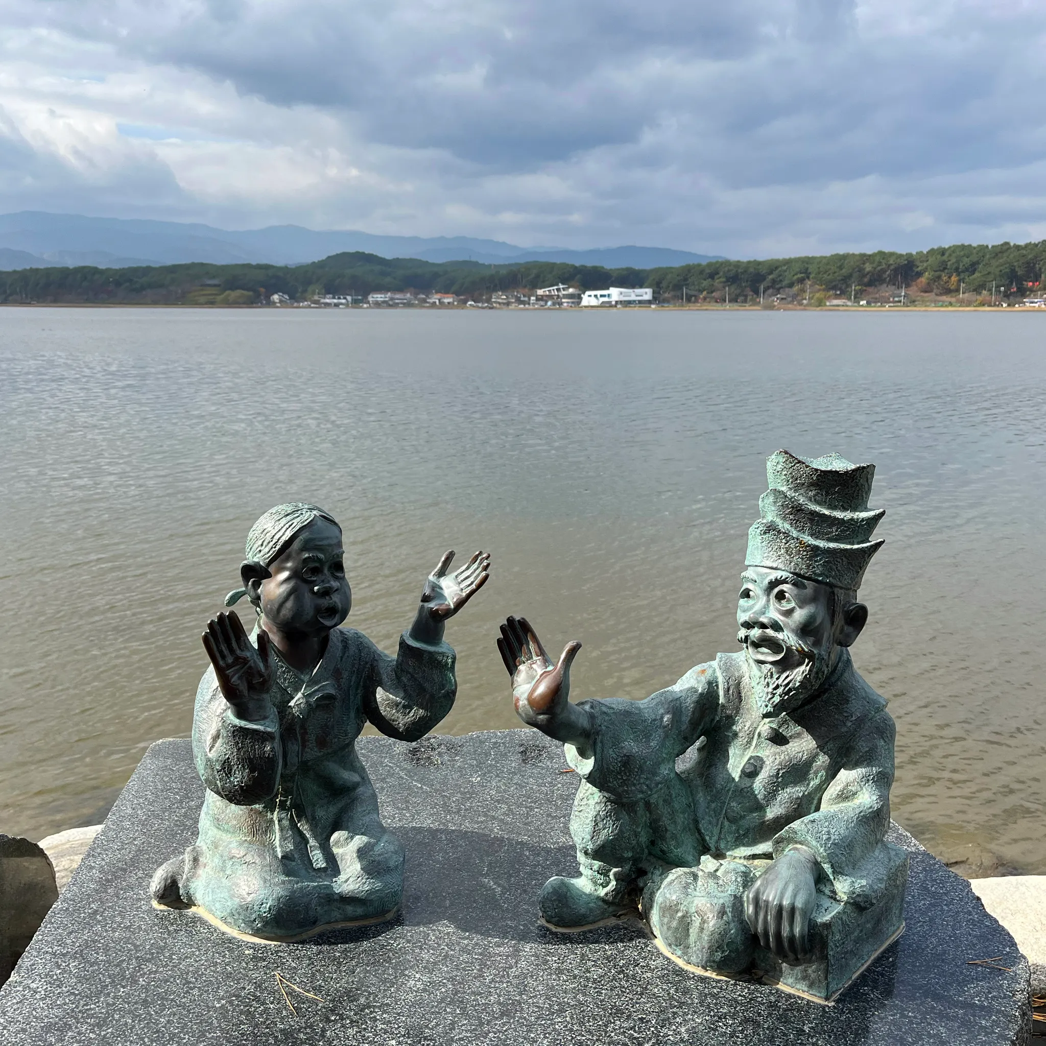 김문기 작가의 홍길동전 캐릭터들이었다. 사진 속 조각은 홍길동의 아버지 홍판서와 부인 유씨. 홍길동전의 스토리에 따라 경포호 둘레로 쭉 이어져있는데, 마지막은 청년 홍길동으로 끝난다. 오래 전 문학 시간을 회상하면서ㅎ 구경하면서 걷는 재미가 쏠쏠.