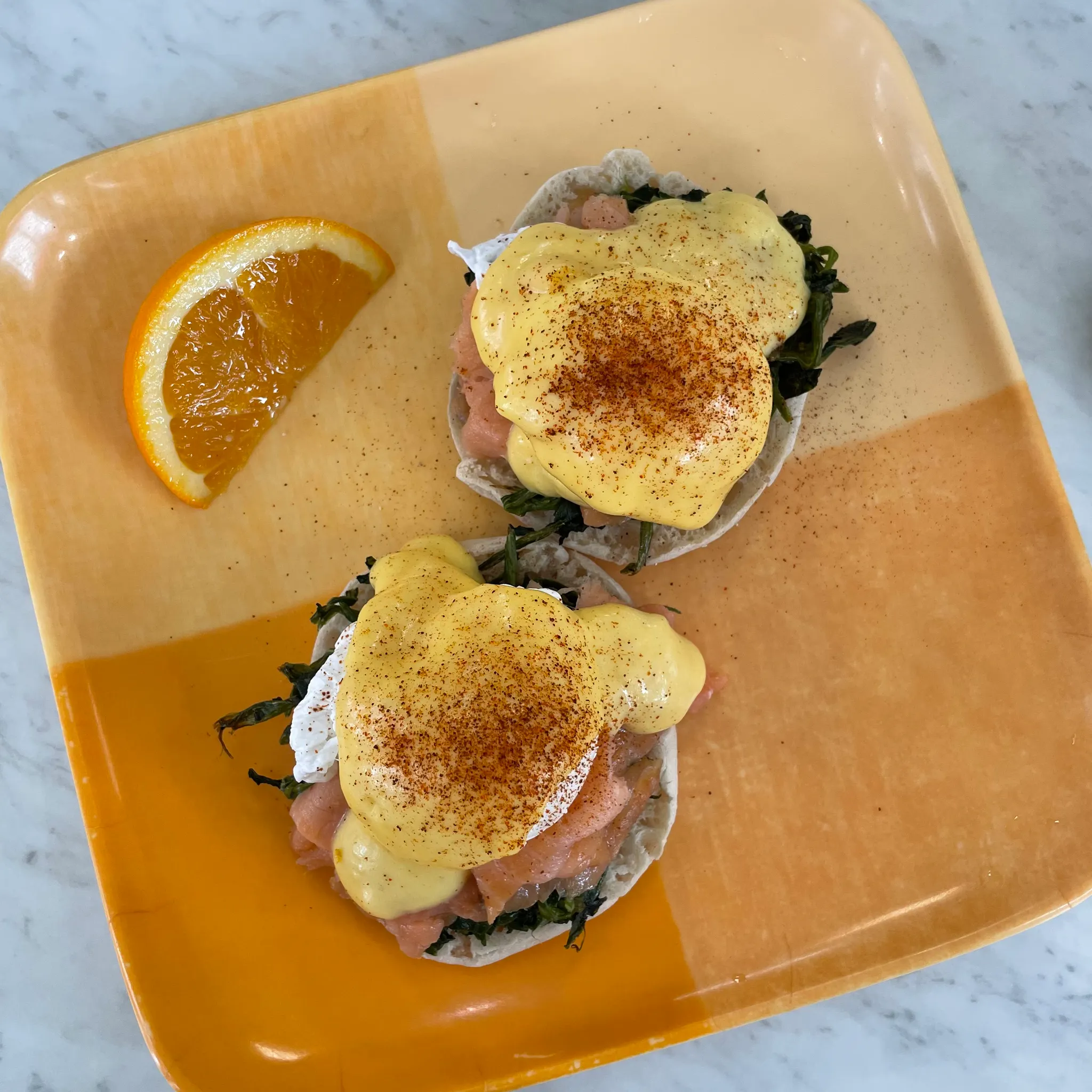 우리가 주문한 첫 번째 메뉴. 수란이 올라간 연어 베네딕트, 메뉴판에 있던 이름은 Lox Florentine이었다. 구운 잉글리시 머핀에 시금치와 훈제연어, 수란, 그리고 홀랜다이 소스가 올라가 있다. 맛없없 재료를 모아놓으니 정말 딱 조화롭게 맛있었다. 시금치 맛도 강하지 않아 괜찮았음! 요거는 이렇게 두 개에 16.95 달러.