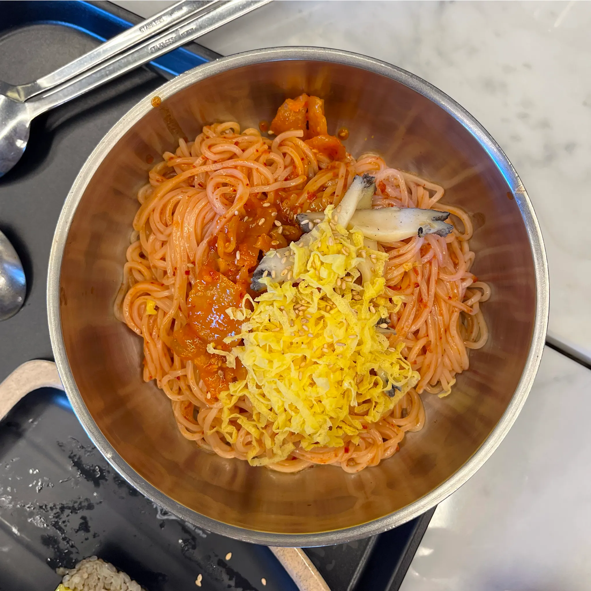 그리고 왠지 아쉬워 추가로 주문한 오징어무침 비빔면. 채소가 들어있지 않아 나는 좋아하고 짝꿍은 아쉬워했다ㅎㅎㅎㅎ 아빠까지 다섯 명이서 짤막한 시간을 보내고 아쉬움을 뒤로 한 채 바로 공항으로