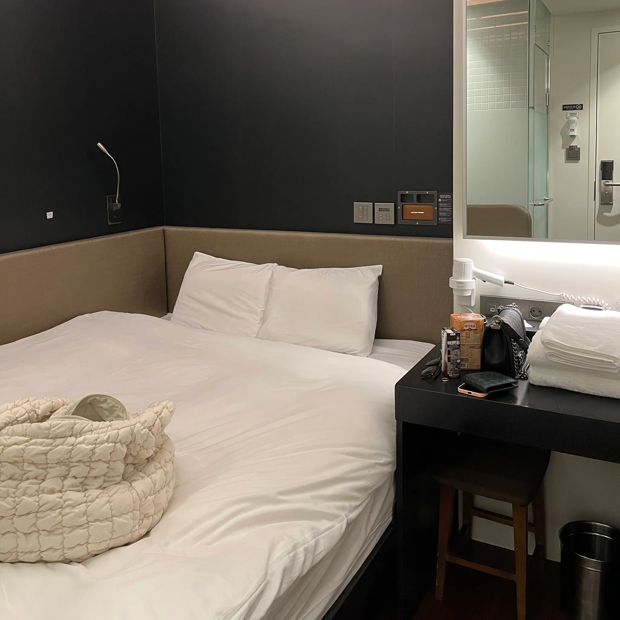 공항버스 막차 타고 온 다락휴! 반년만이다. 우리가 타야할 티웨이 항공은 1터미널에 있는데 원하는 (2인실에 샤워실까지 같이 있는) 객실이 2터미널 다락휴에만 있어서 오사카 때처럼 다음 날 공항셔틀 타고 1터미널로 가기로 했다. 작년 괌 신혼여행 때도, 올해 초 오사카 때도 그랬듯 체크인하고 짐 놓고 바로,