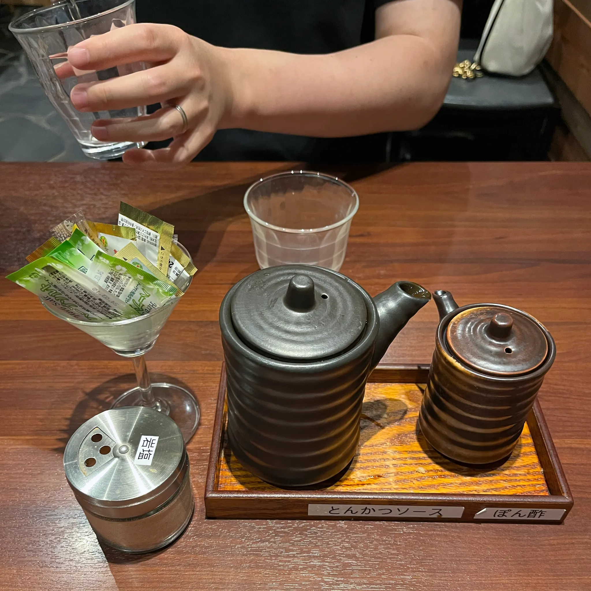 약 한 시간의 기다림 끝에 들어올 수 있었던 돈카츠 와카바. 앞에는 돈카츠 소스와 샐러드 드레싱, 소금 세 종류가 있었다.