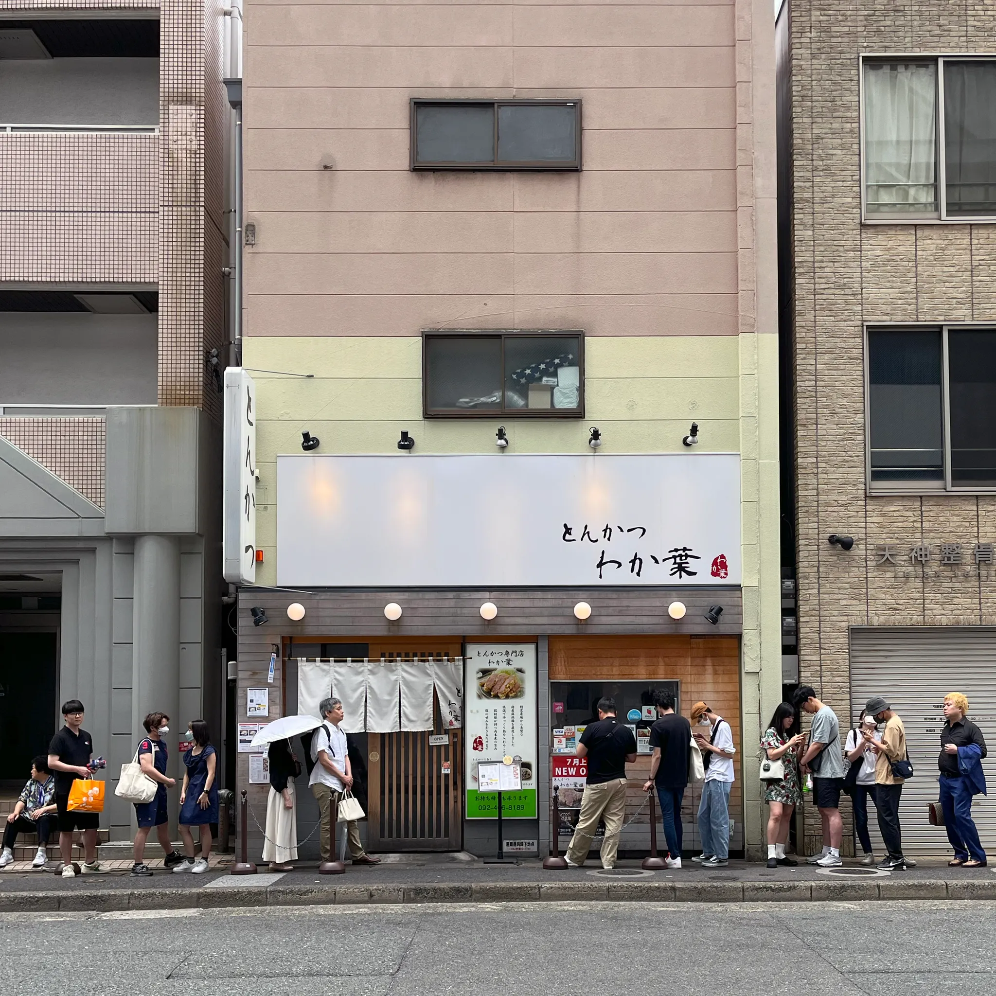 후쿠오카에서의 마지막 식사를 할 곳! 돈카츠 와카바. 오픈 시간이 11시 30분이었는데 조금 지나서 가니 벌써 이렇게 꽤 긴 줄이 형성되어 있었다. 양 옆의 줄이 서로 다른 줄은 아니고, 왼쪽에 있는 사람들을 오른쪽으로 보내는 방식이었다. 아무래도 도로가 좁아서 그런 듯 했다. 나중에 알고보니 웨이팅 많기로 유명하다고 함,,