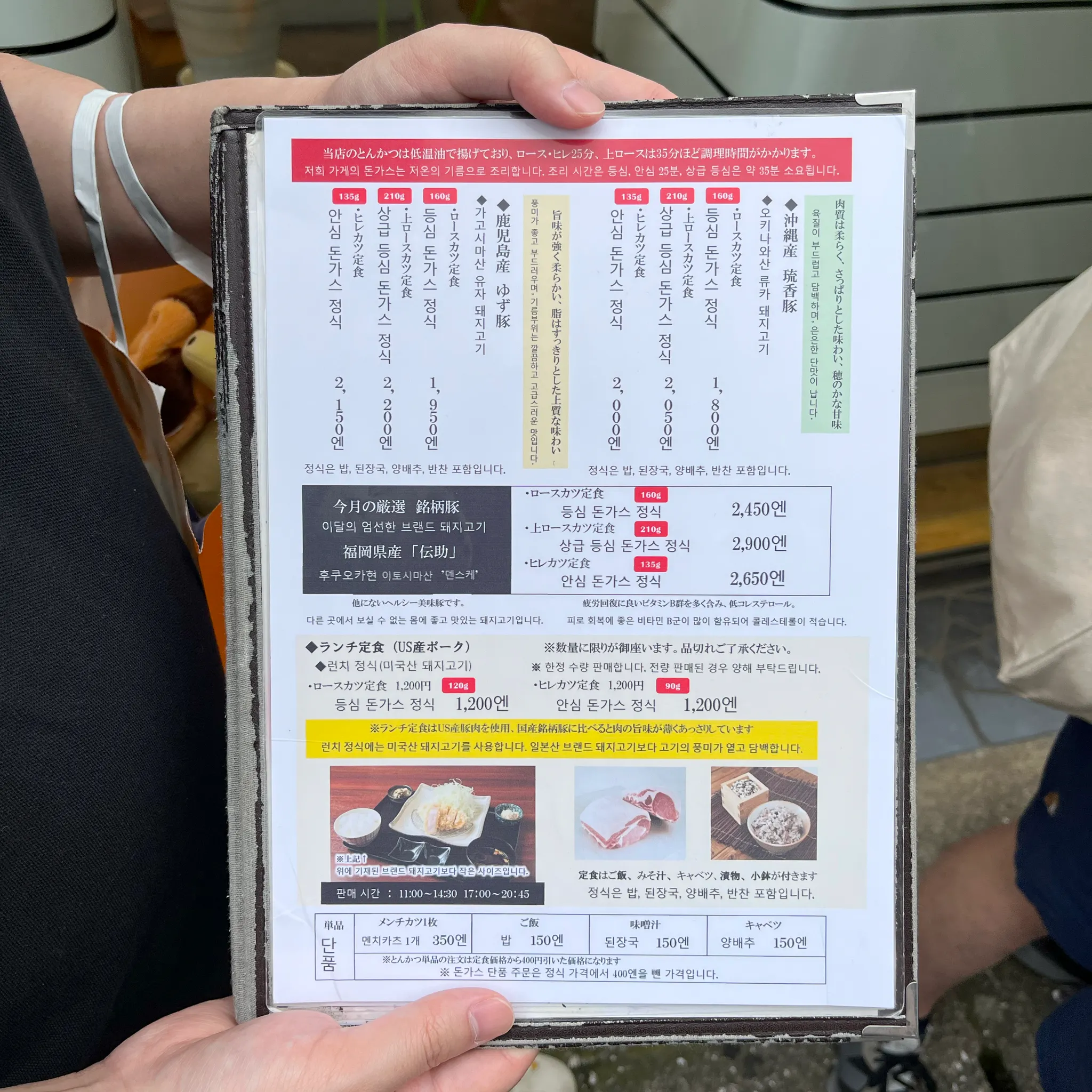 일정 순서가 되면 직원분이 메뉴판을 나눠준다. 주문을 미리 받아서 들어갔을 때 오래 기다리지 않게 하기 위함인 것 같았다. 고기는 원산지에 따라 가고시마산, 오키나와산, 이토시마산 총 세 가지가 있고 그 중에서 안심과 등심이 있는 와카바의 돈카츠들.