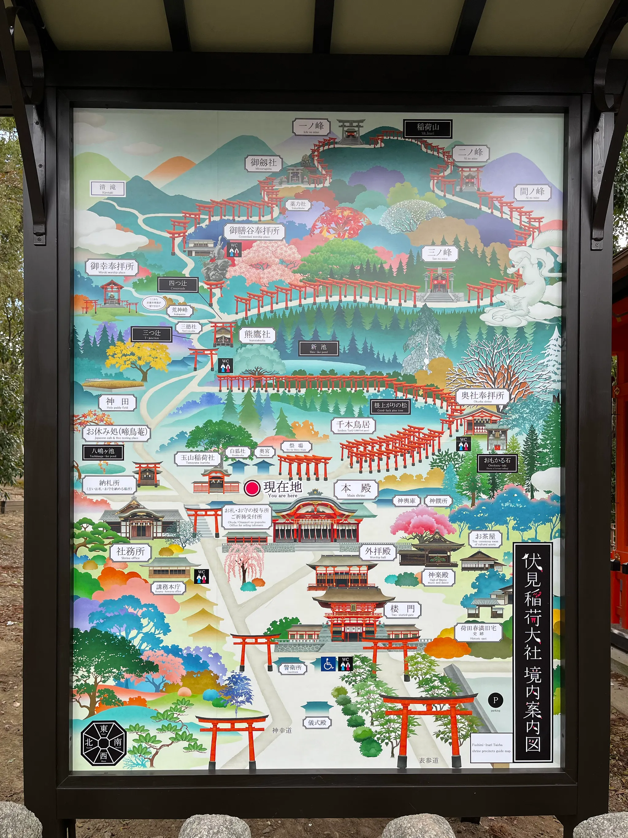 후시미이나리 신사의 안내도. 후시미이나리 신사는 토리이가 많기로 유명한데, 약 만 개의 토리이가 상 정상까지 이어져있다고 한다. 일본에서 가장 많은 토리이가 있는 신사라고 함! 정상까지는 두 시간 정도 걸린다는데,, 너무너무 가보고 싶었지만 그러면 이후의 일정을 모두 취소해야해서