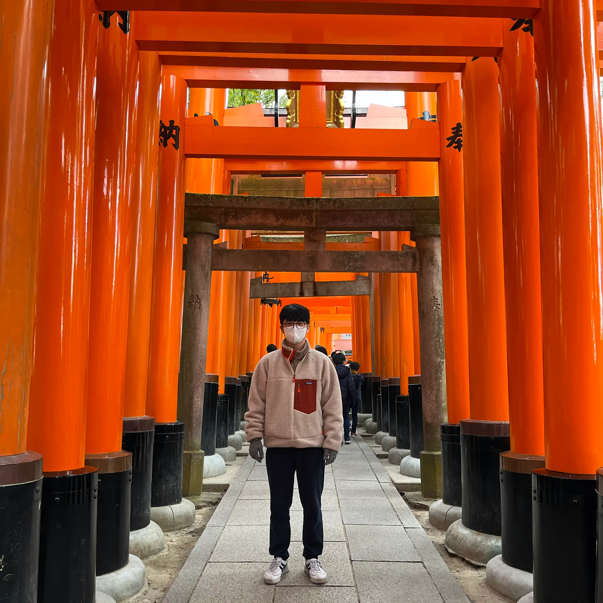 에도 시대부터 소원을 빌거나 소원성취에 대한 감사를 담아 토리이를 하나씩 심은 것이 기원이 되어 이렇게나 많아졌다고 한다. 빨간 문에 받침 부분이 검은 색이라 여우 다리 같아보였다.