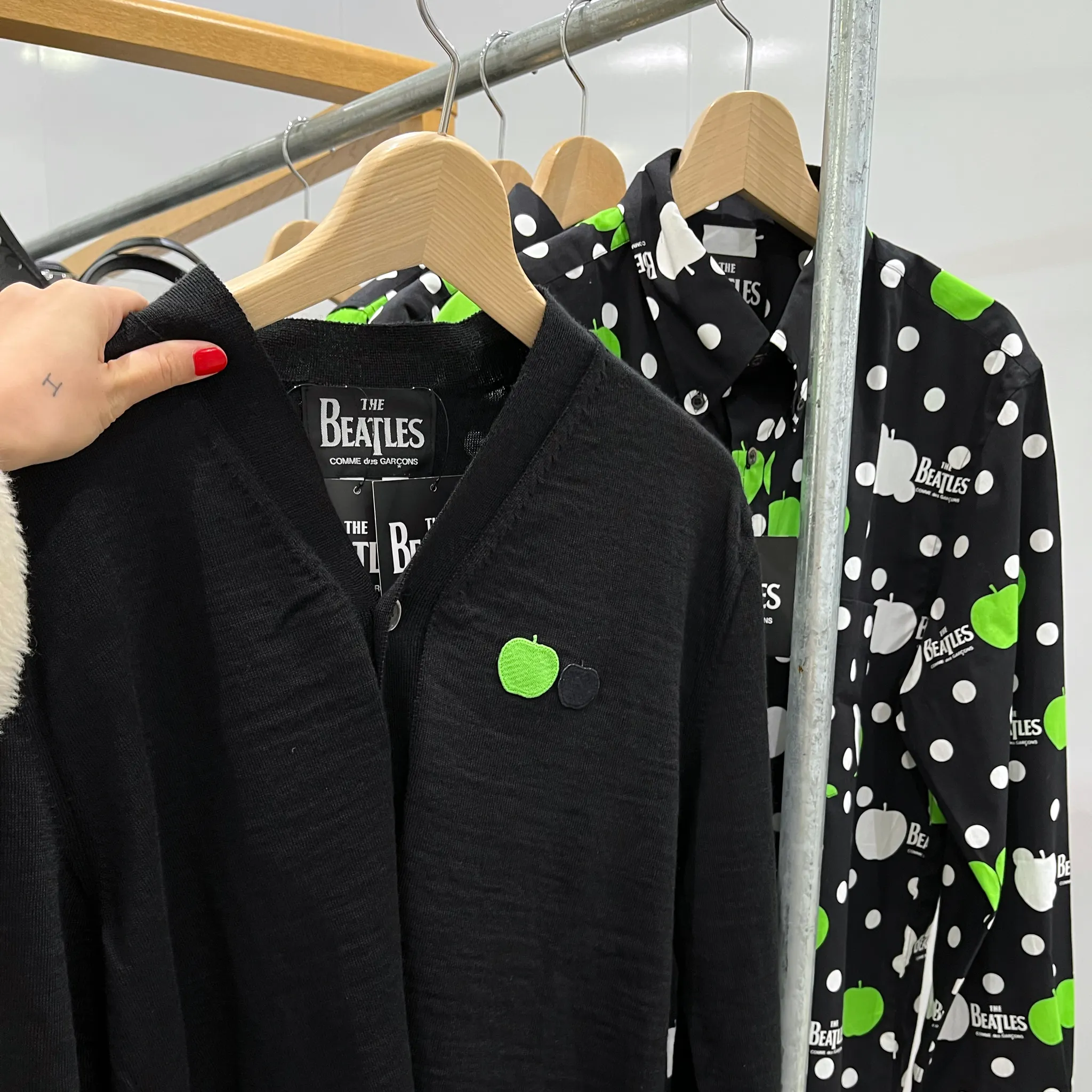 가디건 들고 매장 여기저기 구경 중. 꼼데가르송 비틀즈 에디션. Hey Jude하면 바로 떠오르는 초록 사과가 있다