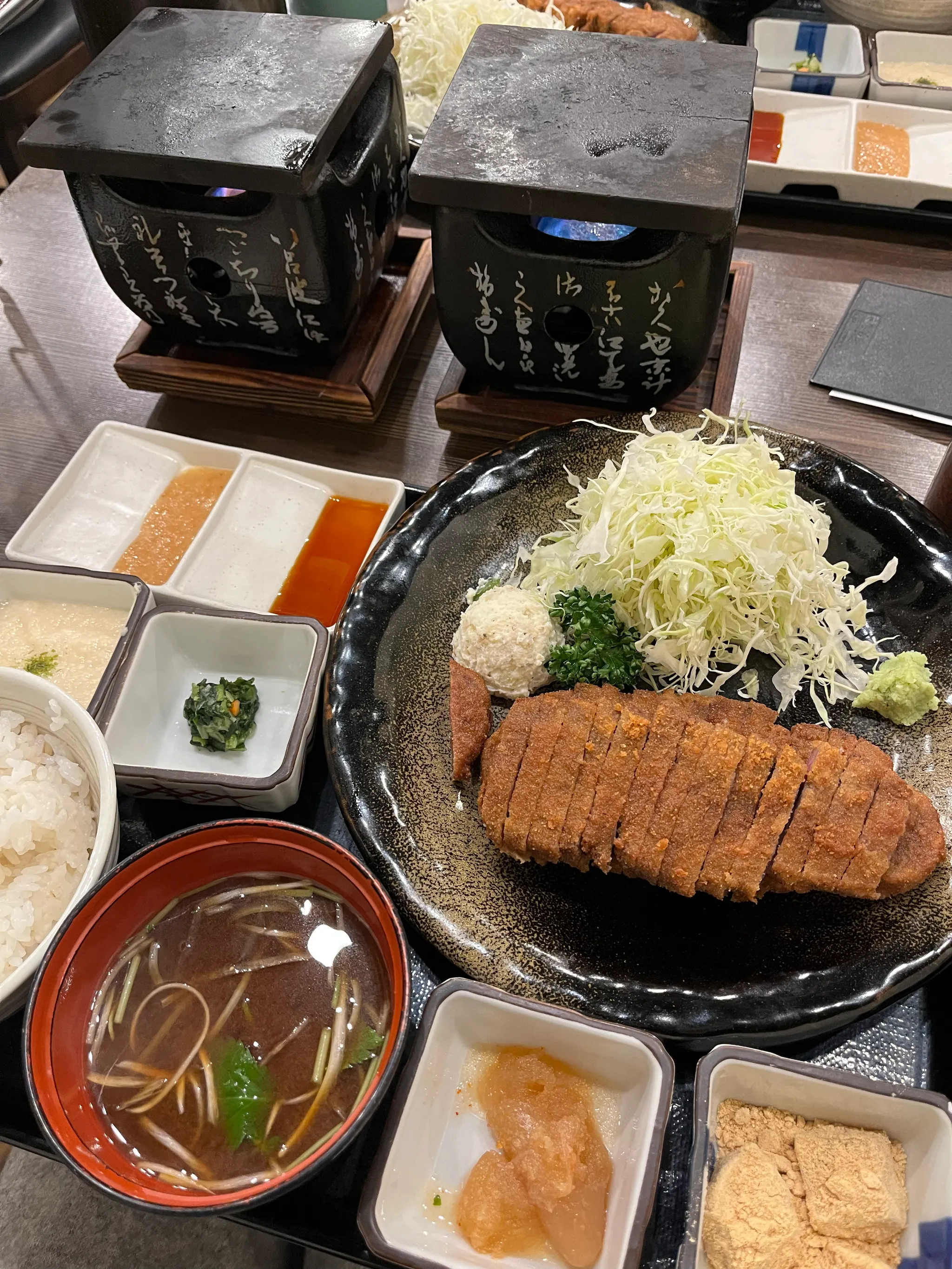 규카츠는 그냥 먹어도 되고 이렇게 화로에 취향대로 구워 먹어도 된다. 조금 굽기도 하고 많이 구워보기도 하고, 여러가지 소스에 찍으면서 다양한 방법으로 먹을 수 있었다. 개인적으로 안 구운 규카츠에 와사비 조금 올려서 먹는 게 제일 맛있었다. 짝꿍은 맛있긴 하지만 먹다보니 느끼하다면서 나한테 거의 1/4 가량을 넘겨줌. 이득ㅎㅎㅎㅎㅎ 느끼한 고기 잘 못 먹는 사람들은 별로일 수도 있을 것 같다.