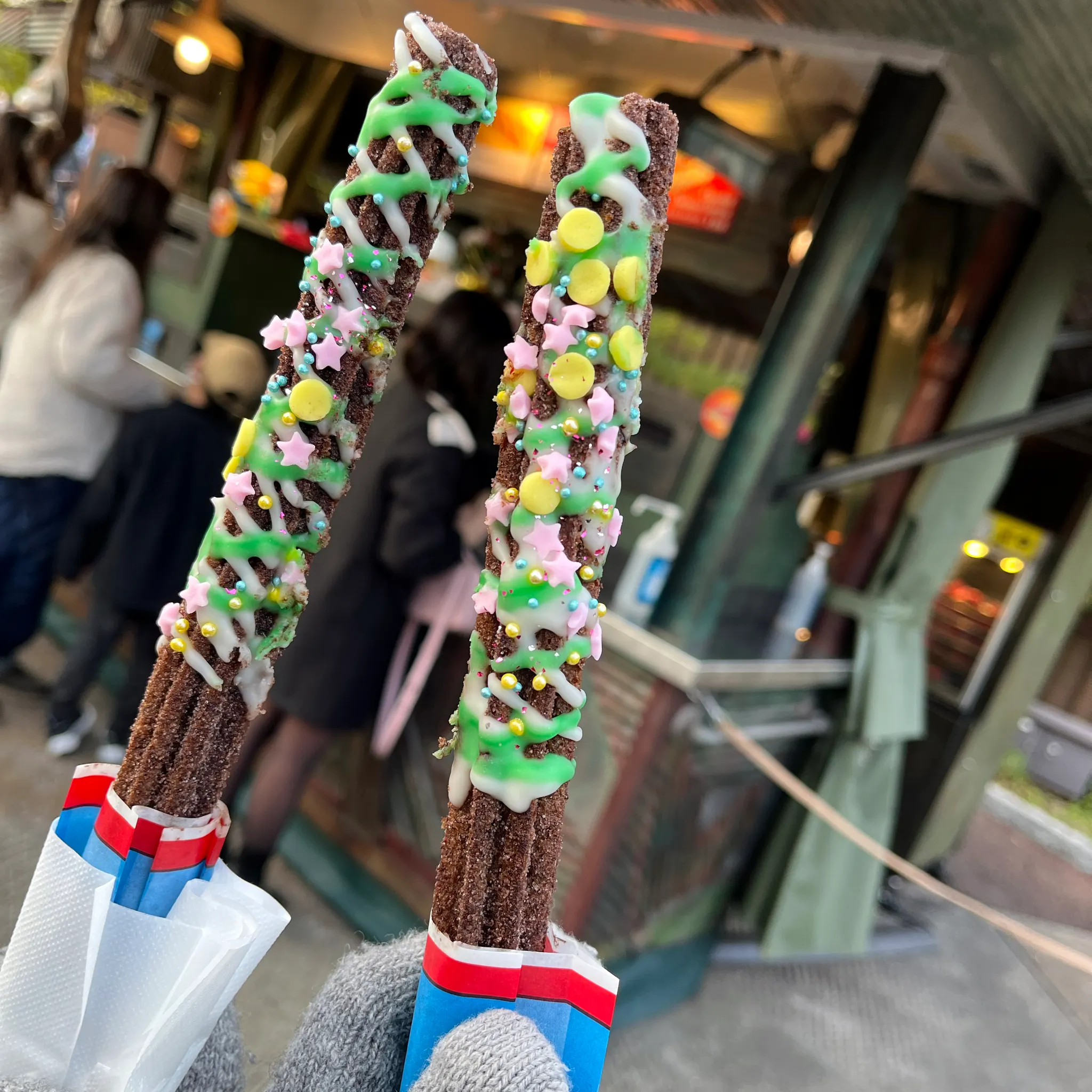 맛은 상상가는 초코 츄러스 맛! 맛있는 맛! 두 개에 1,200엔.