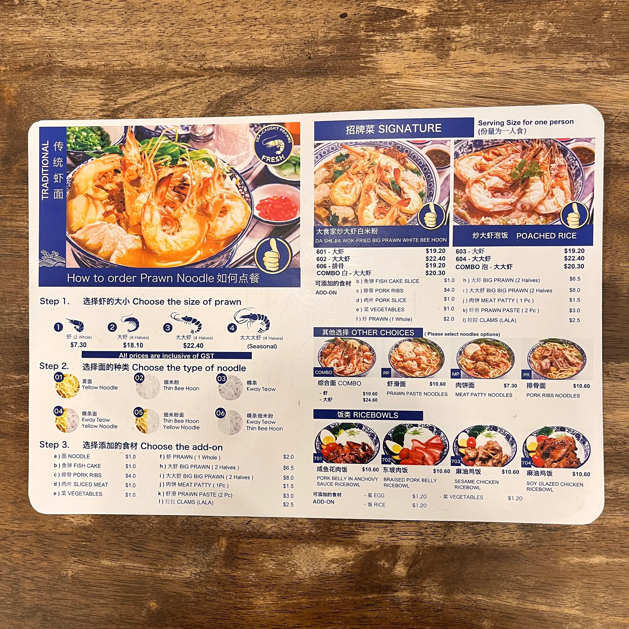 가고 싶었던 새우 국수 식당 문 닫을까봐ㅎㅎㅎㅎㅎ 다행히 라스트 오더 전에 도착했다 휴우! 한국인들에게 가장 유명한 싱가포르 새우국수는 블랑코라는 곳인데, 내가 찾은 곳은 Da Shi Jia Big Prawn Mee 였다. 새우 크기나 국수 종류, 토핑을 마음껏 고를 수 있다는 게 신기했던 곳. 우리는 새우국수와 새우 볶음면, 청사과주스를 주문했다