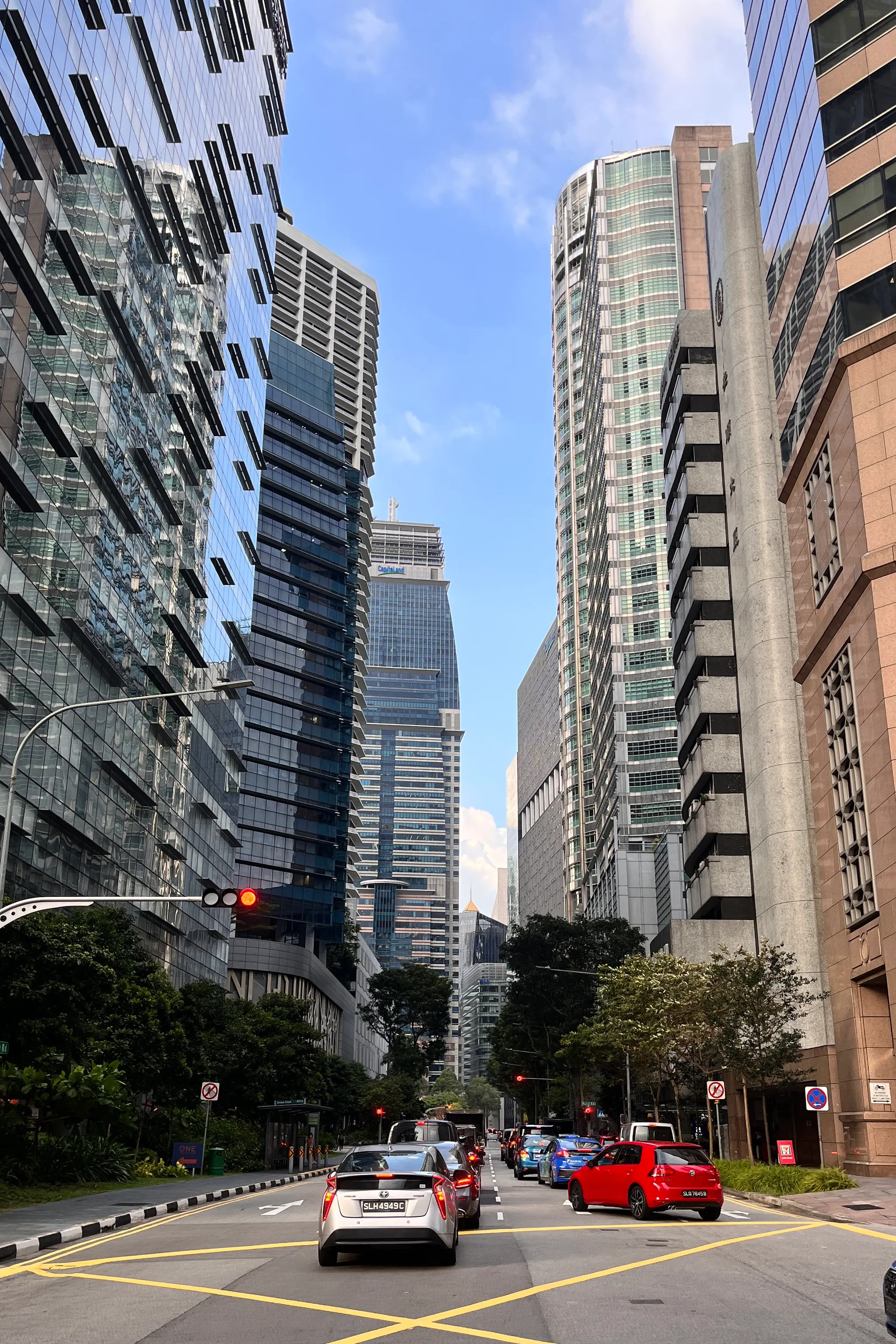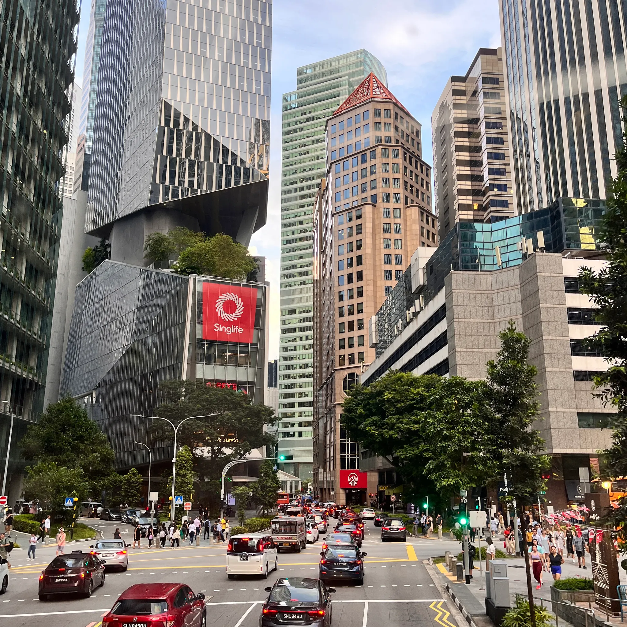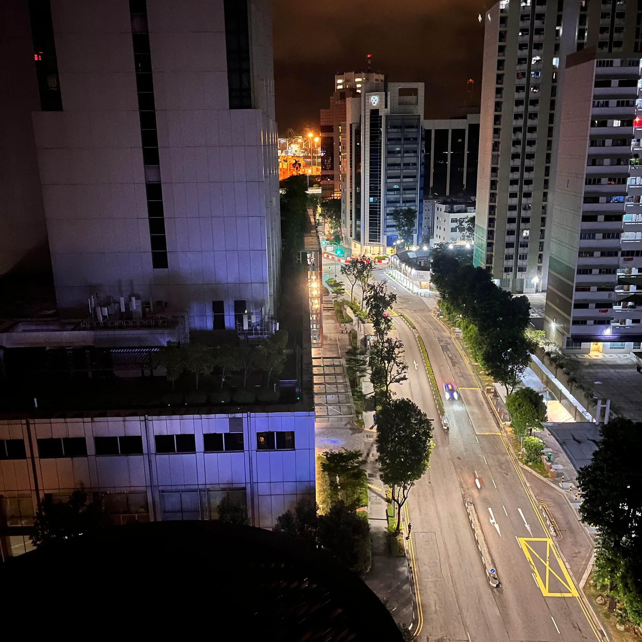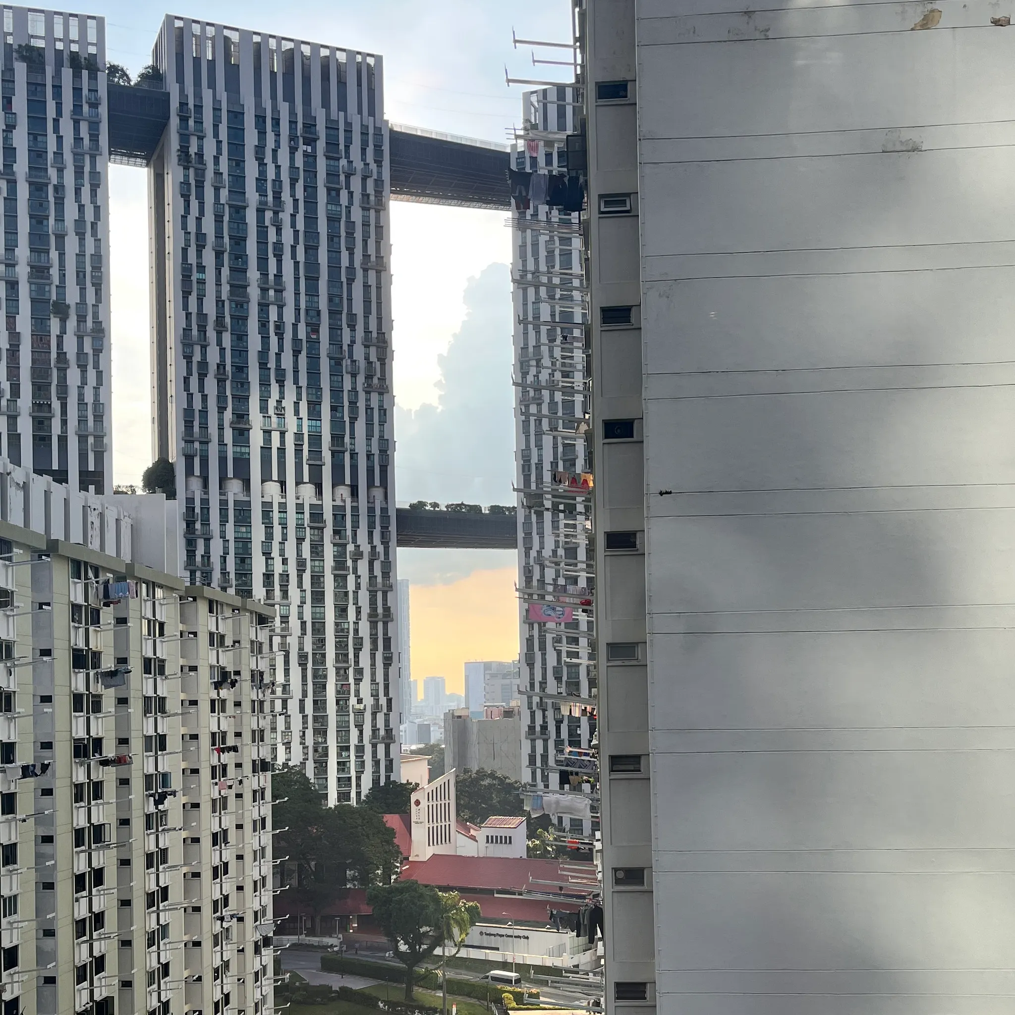 싱가폴에서 찍은 도심 사진 중 가장 마음에 드는 사진은 바로 이 사진! 해가 질 무렵의 은은한 빛깔의 건물들과 호커센터, 나무들 모든 게 마음에 든다
