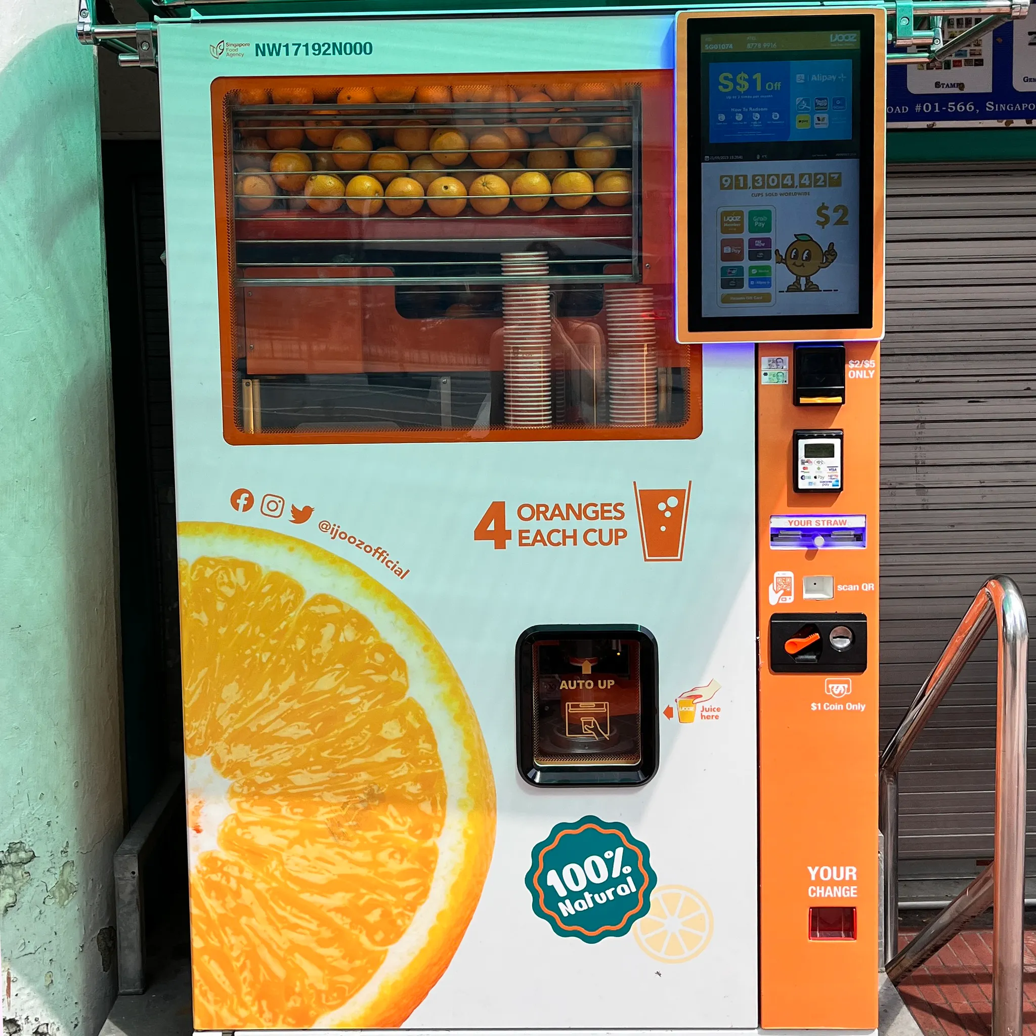 이게 뭐냐면 바로 오렌지 쥬스 자판기! 안에 보이는 생 오렌지를 바로 착즙해서 내려주는 쥬스 자판기다. 싱가폴 여행 정보 검색하다가 본 적이 있는 것 같아서 우리도 한 번 먹어보기로-
