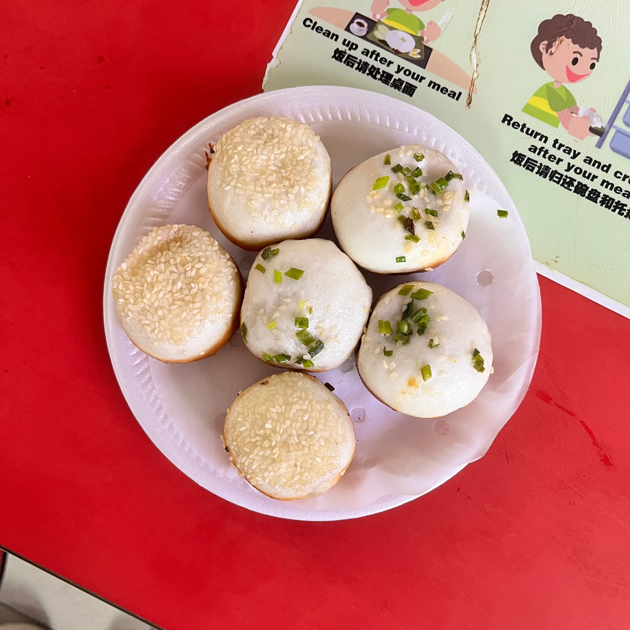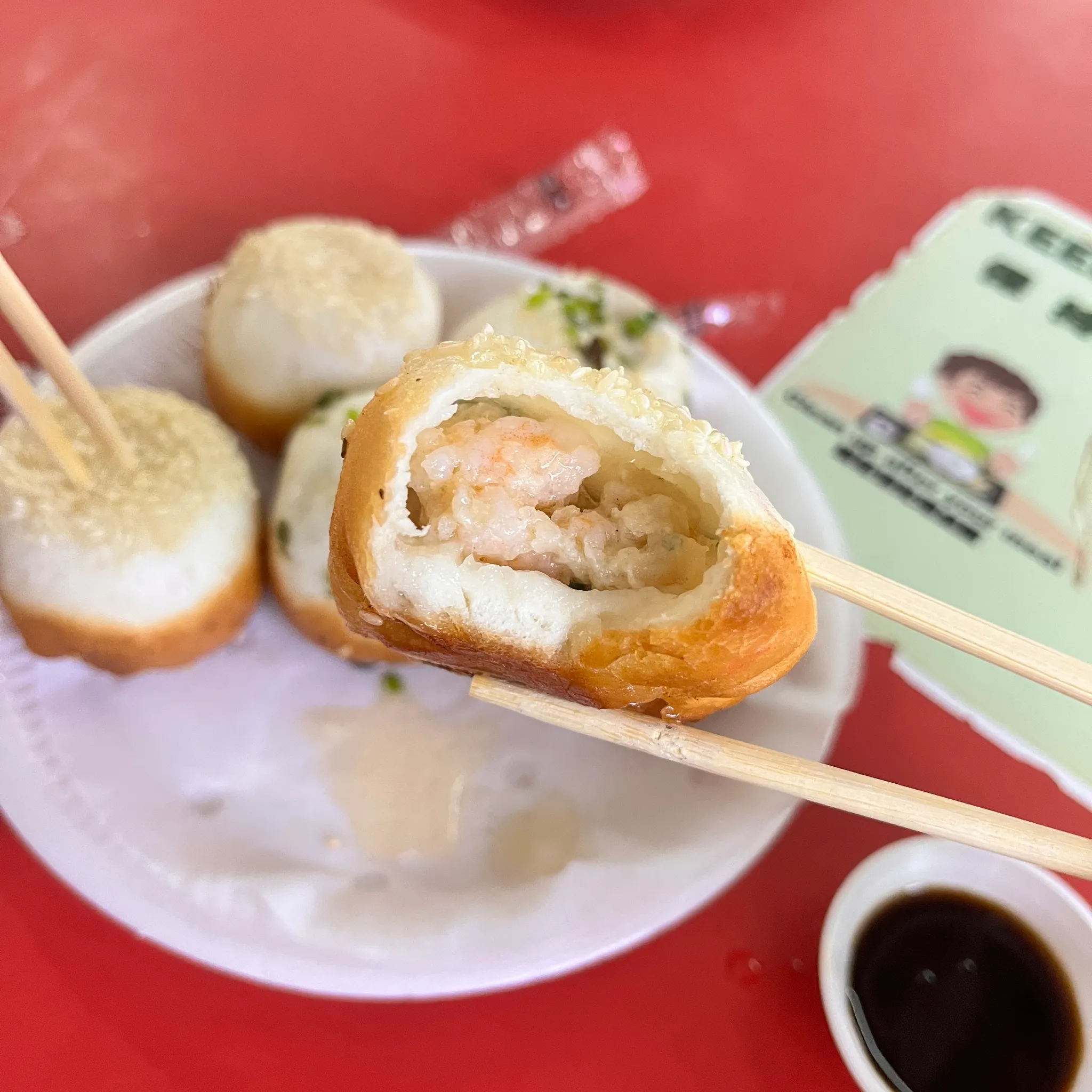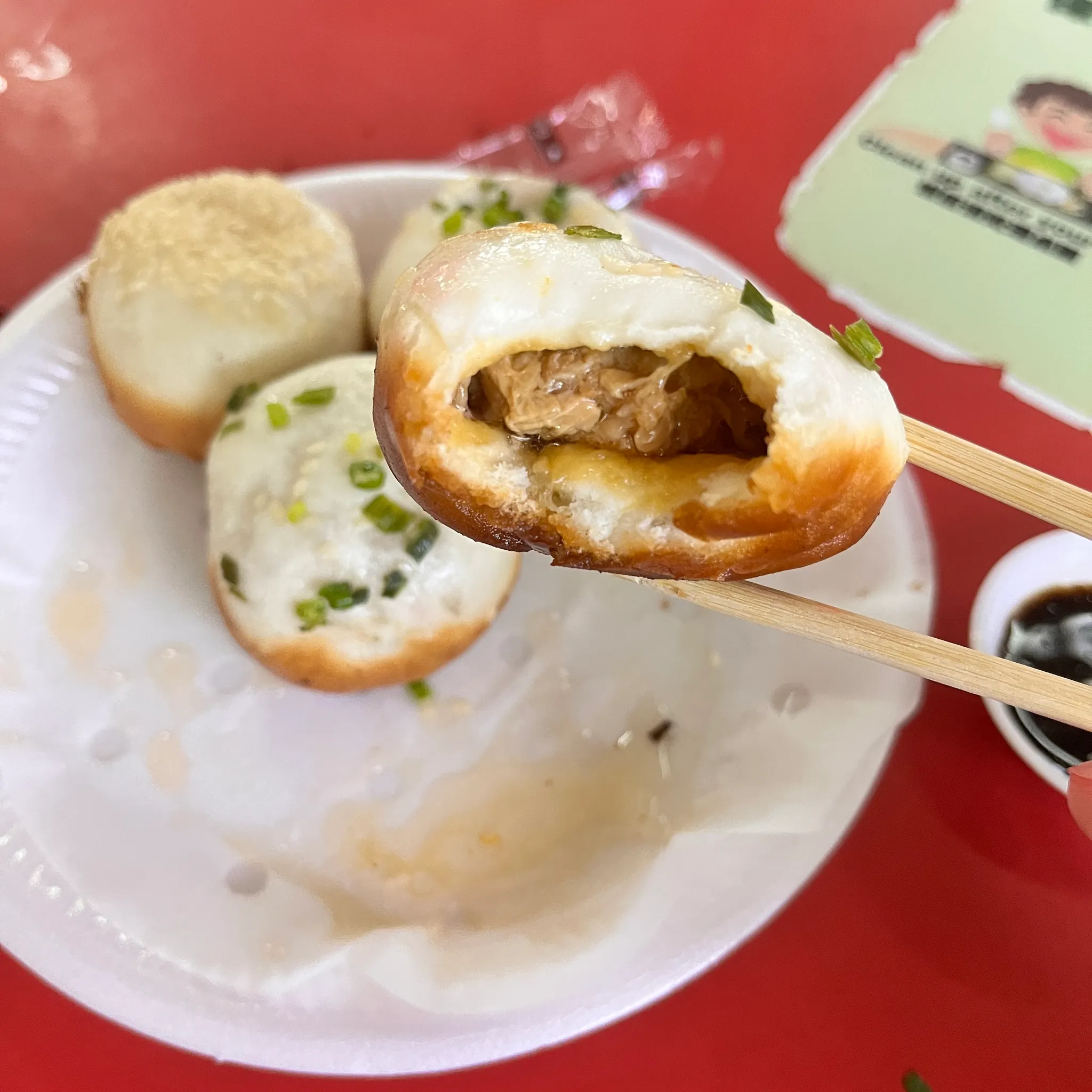 그리고 이게 바로 그 결과물 구운 샤오롱바오 새우 세 개와 돼지고기 세 개. 9 싱달러이고 현금만 받는다