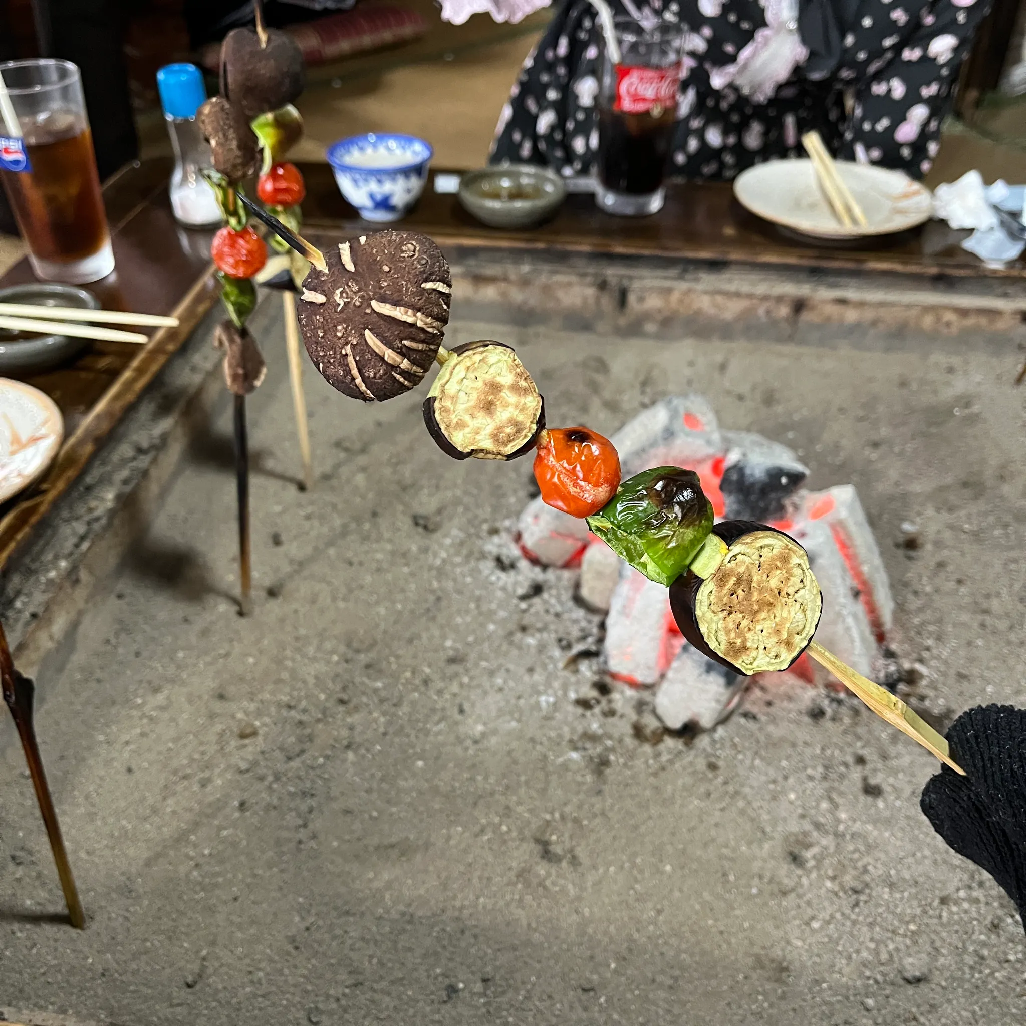 계절 채소나 고기 꼬치를 일본식 전통 화로 이로리에서 숯불로 구워먹는 방식의 덴가쿠