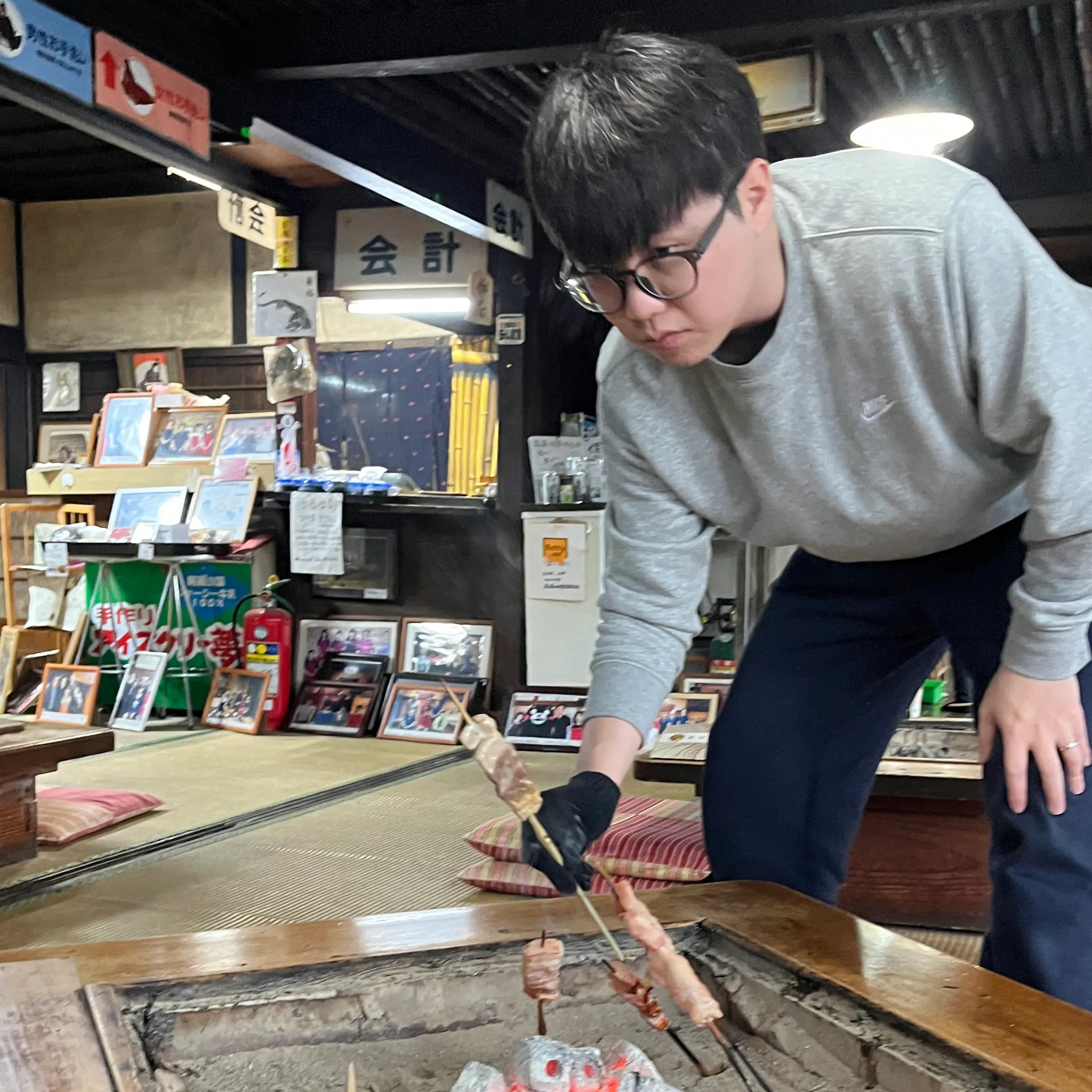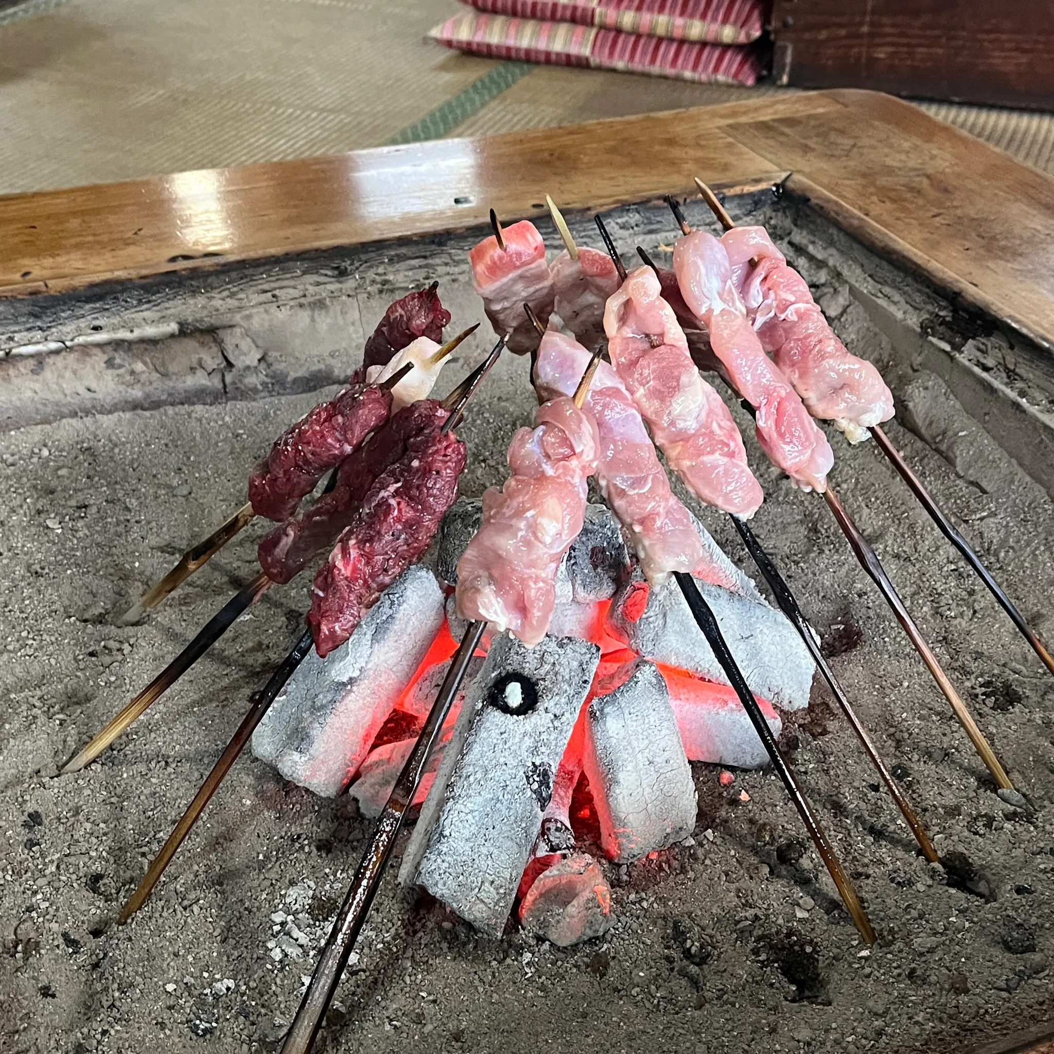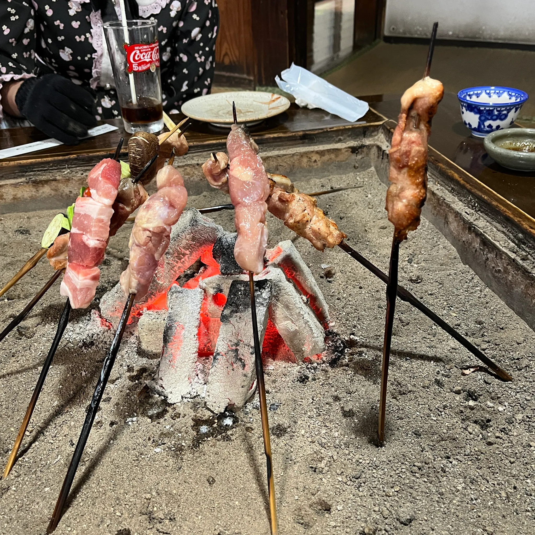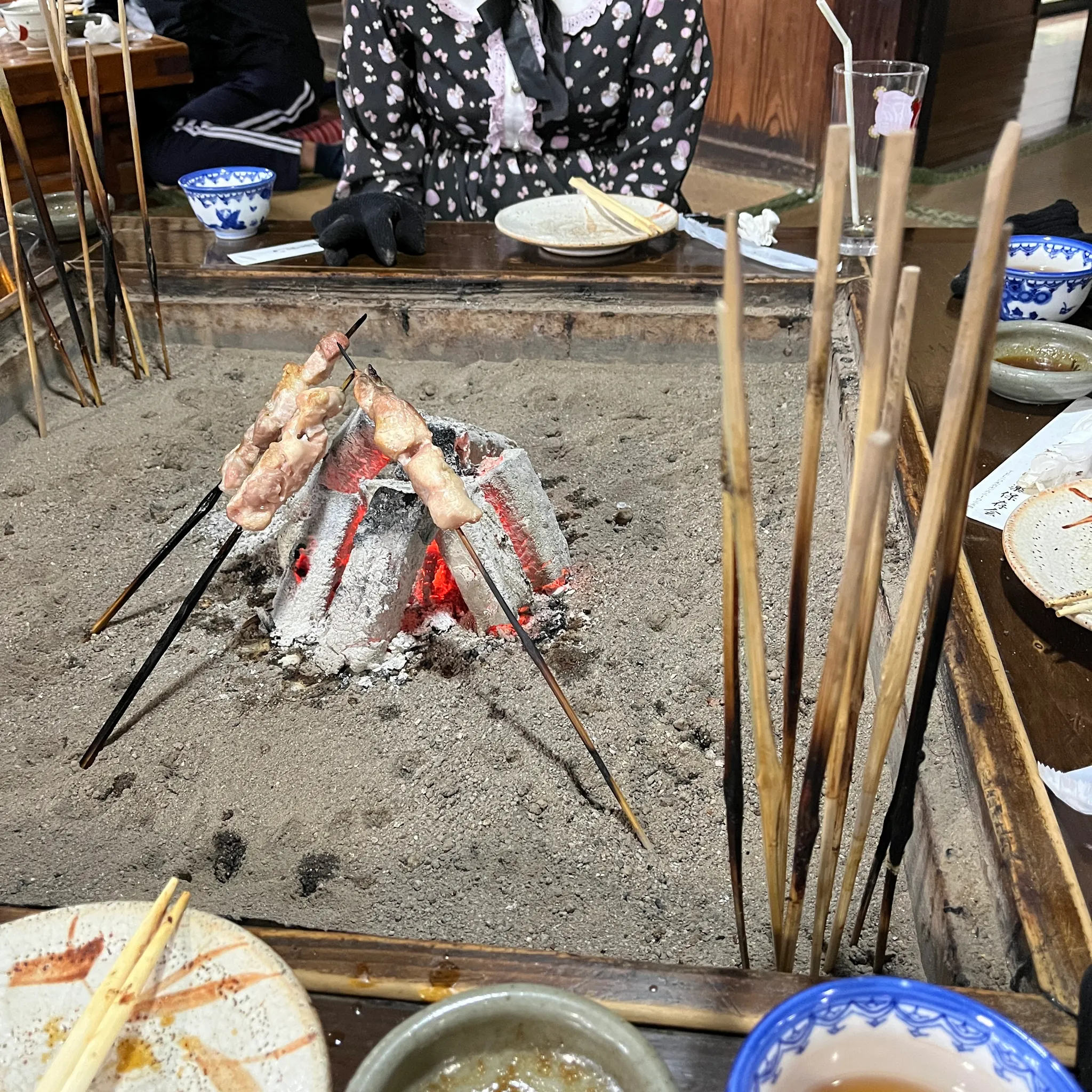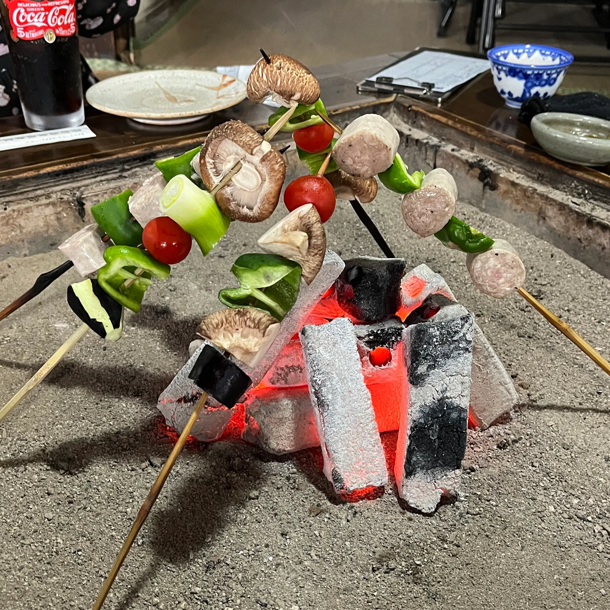 이렇게 숯 주변에 꼬치들을 꽂아서 숯불에 익혀먹는다. 앞뒤로 골고루 구워지도록 한 번씩 뒤집어줘야 하는데 그게 또 나름 재미 요소였다ㅎㅎㅎㅎ 이렇게 꼬치 구이를 먹을 일이 없다보니 엄청나게 전통적인 방식이 신기하기도 하고 색다른 경험으로 다가왔다