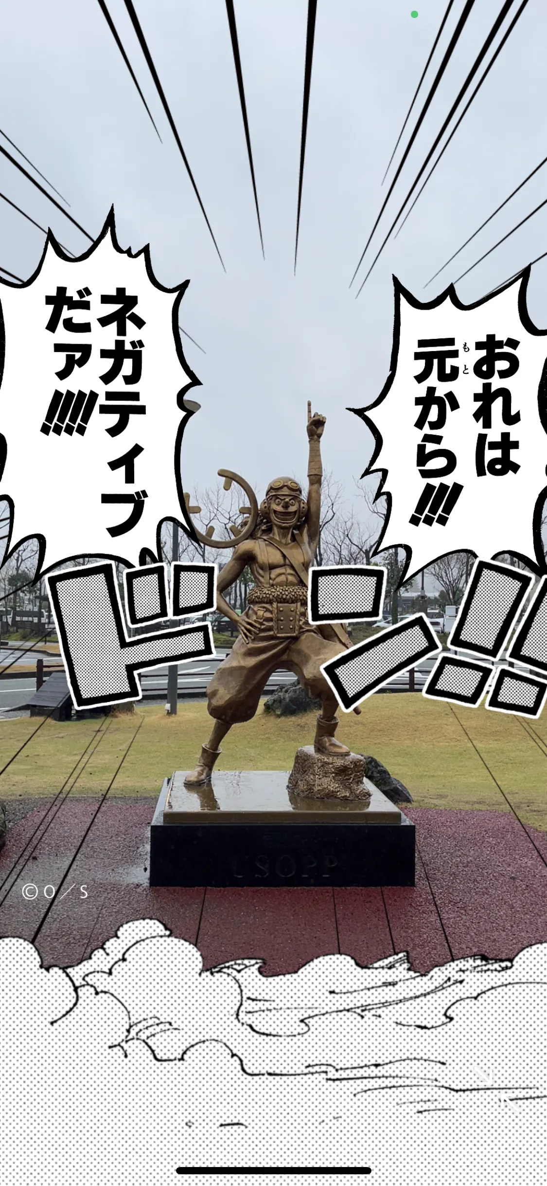 이어서 간 곳은 역시나 원피스 동상 투어, 이번에는 우솝상 보러왔다. 우솝은 아소역 옆에 있다. 비가 조금씩 오긴 했지만 우린 우솝 옆에서 우솝이랑 같은 포즈로 사진도 남겼다 히힛