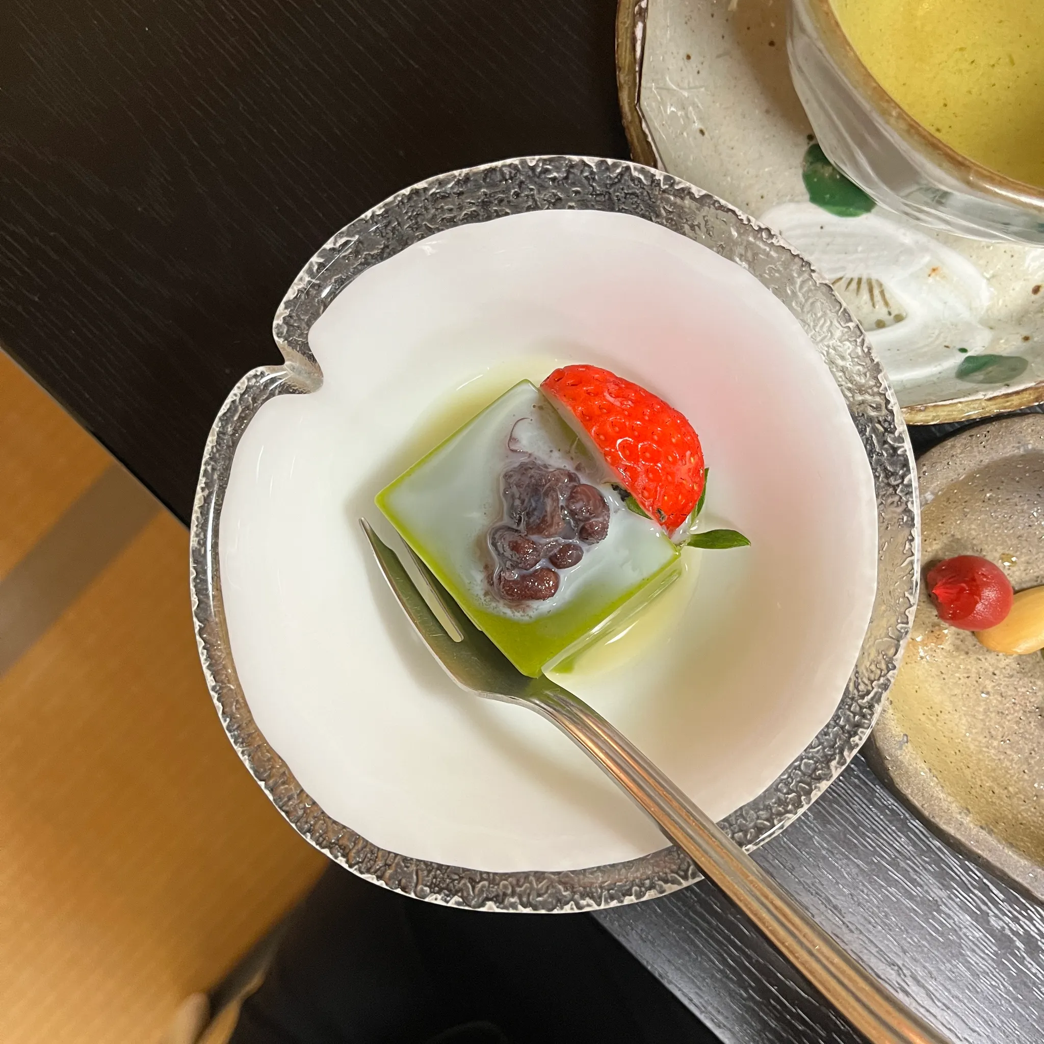 디저트. 말차 양갱같은거 위에 팥이랑 딸기 반쪽